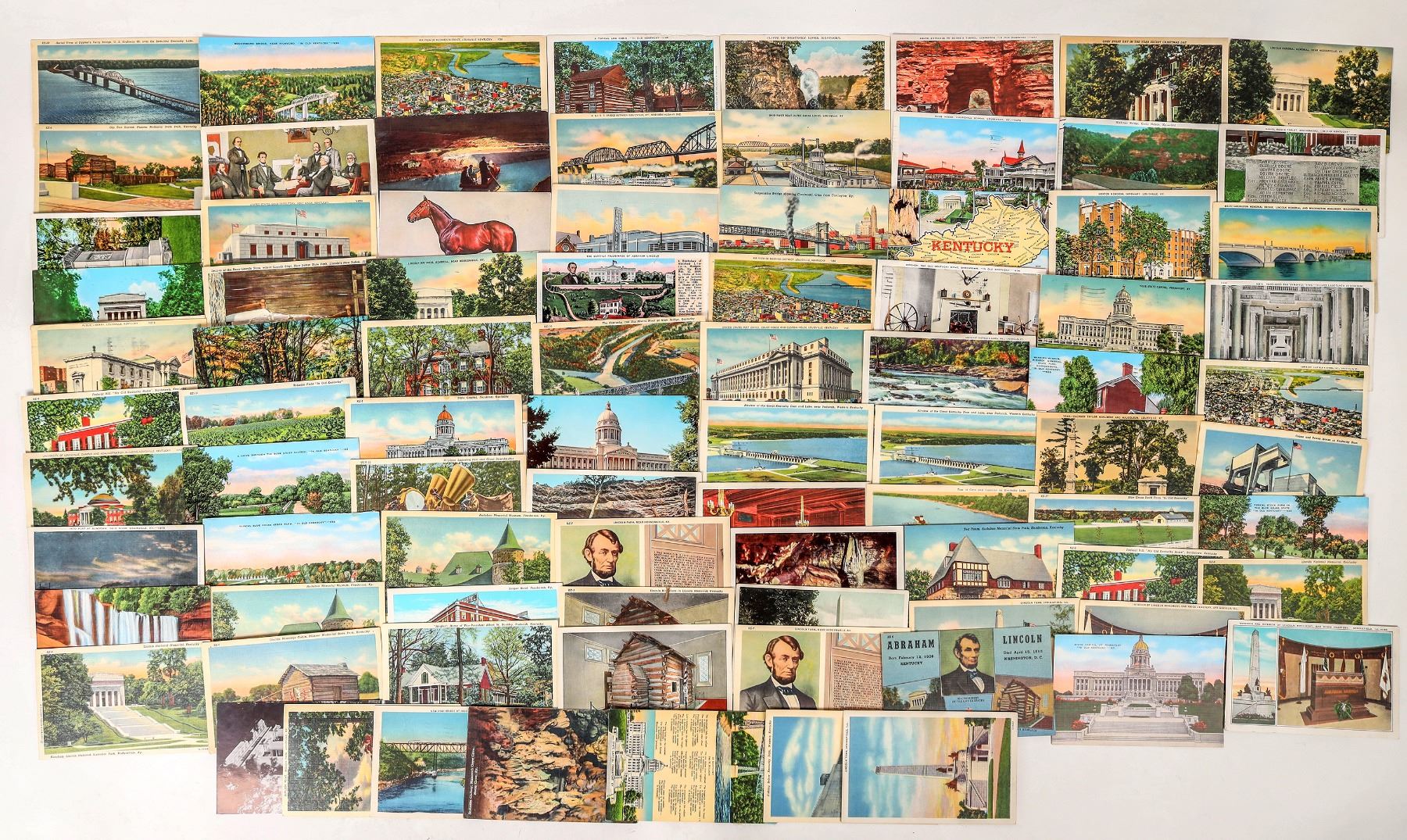 Lot of 86. Linen era post cards. Many Curteich & Co. Wht. border a few borderless. Postmarks : La Grange, Louisville, Cheneyville LA., Boxville KY., Athens GA., Lincoln's New Salem Ill., Wash. D.C. Street level view Several regarding Pres. Lincoln's home-portraits-memorials, Fort Knox, Race Horse "Gallant Man", Daniel Boone monument, Hickman Wooden bridge Camp Nelson,Churchill Downs, River boat in canal locks, Steam Loco on cliffs of Kentucky River, Boat on Echo River 360 ft. underground, Signing of Emancipation Proclamation, Old Fort Harrad, entrance Boone's Tunnel. BIrdseye View ; Business Dist. Louisville, Boonesboro Bridge, Eggner's Ferry Bridge Highway 68 over Kentucky Lake. Kentucky 1930-50's Ken Prag Collection