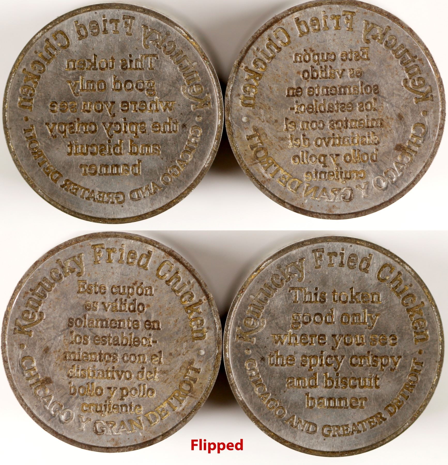 Kentucky Fried Chicken; "This token good only where you see the spicy crispy and biscuit banner;" Chicago and Greater Detroit." Second die says the same but in Spanish. NWT Mint Historical Die Collection.