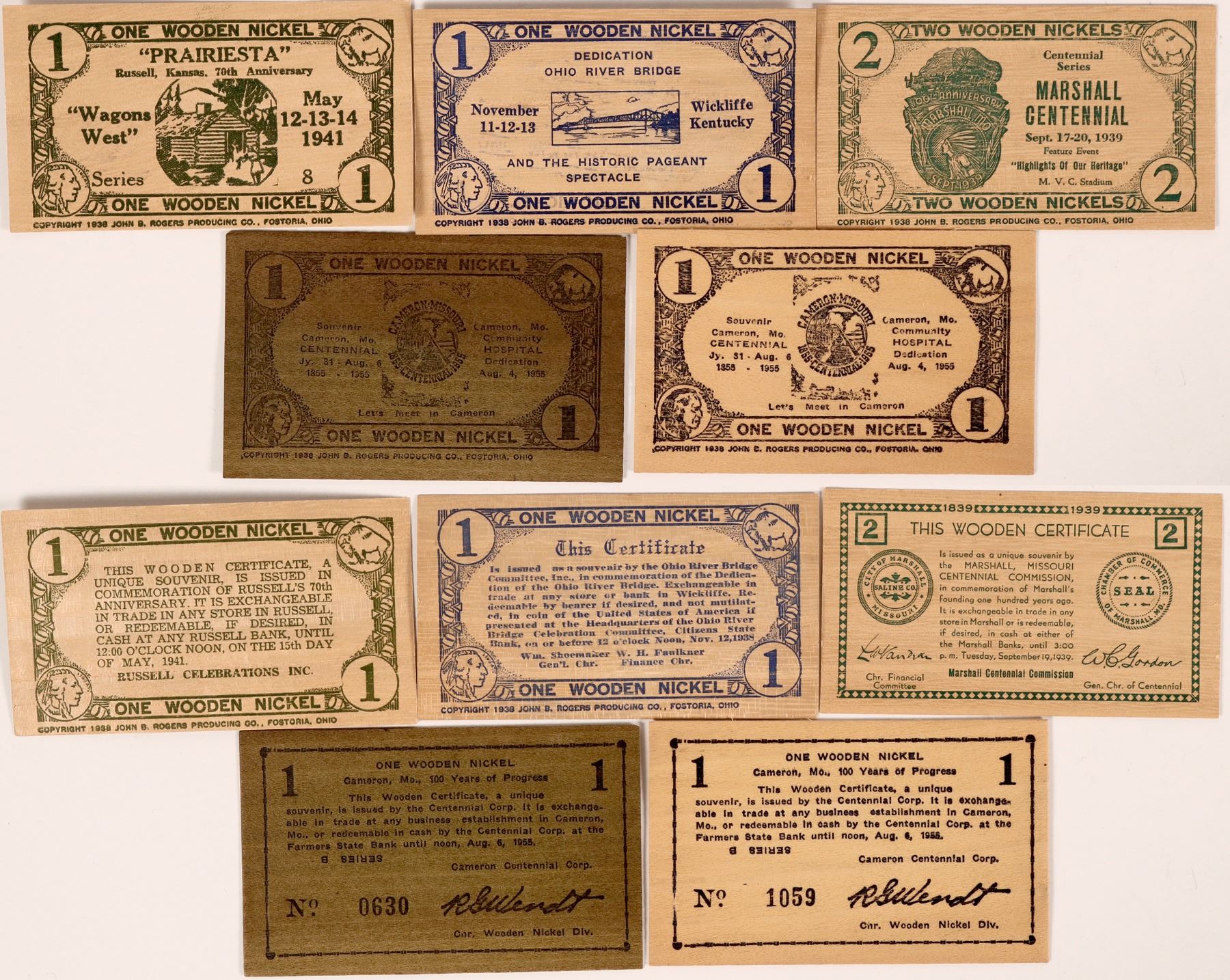 1. Marshall Centennial, 1939, Blue, Two Wooden Nickels, vignette 100th Anniversary w/ Indian Head looking r-l, Oxen drawn Calistoga Wagon (very ornate). Reverse seal of City of Marshall and seal of Chamber of Commerce, Missouri.
