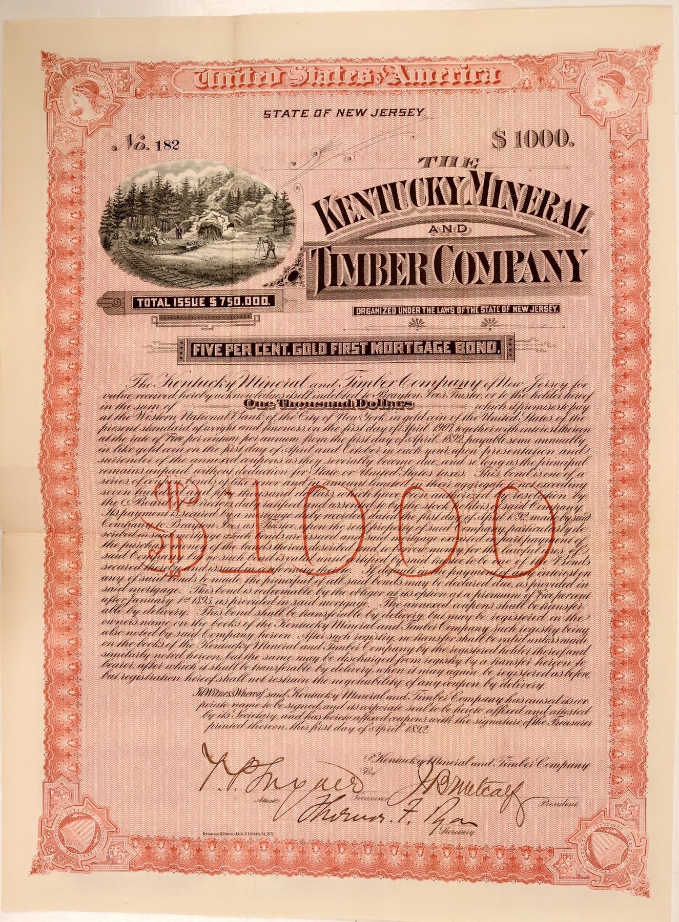 Cert. #182, $1,000, 5%, First Mortgage Gold Bond issued in 1892. Great vignette of a group of miners outside the mountain mine portal, two surveyors out front, an ore car and the railroad tracks. Signed by J.B. Metcalf as president and Thomas F. Ryan as secretary. Thomas Fortune Ryan was a U.S. tobacco and transport magnate. Ryan was perhaps the greatest benefactor of the Roman Catholic Diocese of Richmond in the decades before the Great Depression as he helped pay for the construction of the Cathedral of the Sacred Heart in Richmond, Virginia (wiki).The bond was due in 1907. The company was incorporated in New Jersey. The bond has red borders and background on large white paper. The total issue was $750,000. The New York and Kentucky Land Company was the predecessor of this company. Thirty coupons attached at the right. Uncancelled.