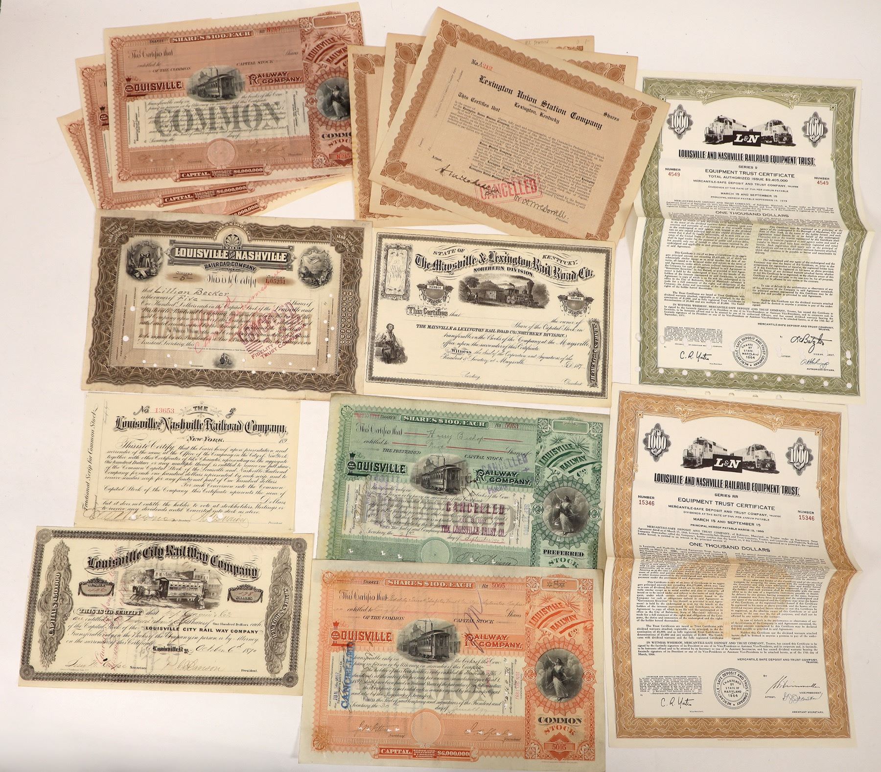 Issued stocks-1870 Louisville City RW, 1903 and 1897 Louisville RW, 1926 Lexington Union Committee. Unissued-Louisville and Nashville, 2x Lexington Union Station, Maysville & Lexington, 3x Louisville RW. Bonds-1966 and 1971 Louisville and Nashville RR Equipment.