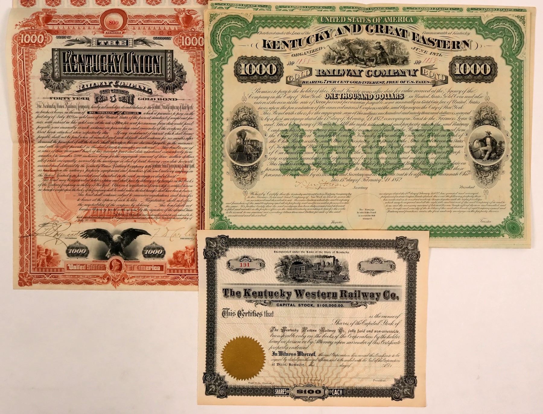 2. The Kentucky Western Railway Co. incorp Kentucky 1899. #191, U/U, $100 par common stock, gold seal, vignette top 4-4-0 exiting tunnel, gold sunburst underprint, dateline 1___, mount & Co. printer. AU.