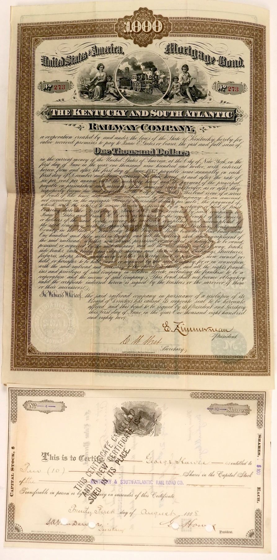 Two certificates. !. The Kentucky and South Atlantic railway Co. incorp 1882 Kentucky. #273, I/U, $1000, 6%, Mortgage Bearer Bond due 1912. Issued June 1, 1882, signed E. Zimmerman president, Brown, embossed corp seal (very crisp stamp), "ONE THOUSAND DOLLARS" in brown underprint, vignette top 4-4-0 w/car l-r female and child on either side. Coupons 1-60 attached. American Bank Note Co printer. EF-AU