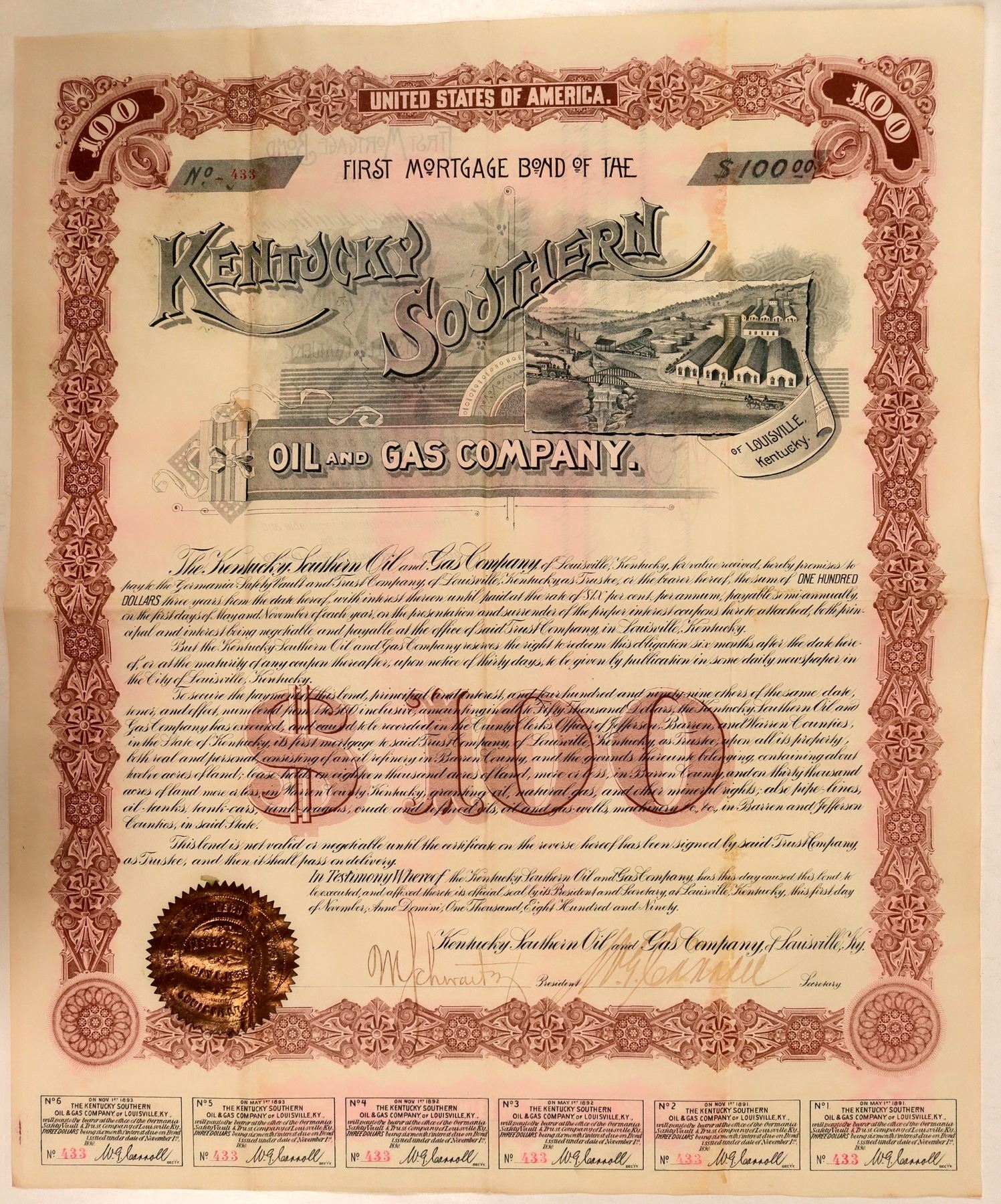 Very ornate and attractive bond certificate issued in 1890. Cert. #433, $100, First Mortgage Bond. Full name was Kentucky Southern Oil & Gas Company of Louisville, Kentucky. Nice vignette of buildings, oil tanks, a train approaching the trestle and a horse drawn carriage. Black on creme. with reddish borders. The company was composed of mostly Pittsburgh capitalists, and the company was refining Kentucky crude at Oil City, Barren County, Kentucky (Paint, Oil & Drug Review, 1890). Uncancelled. Six coupons attached at the bottom.