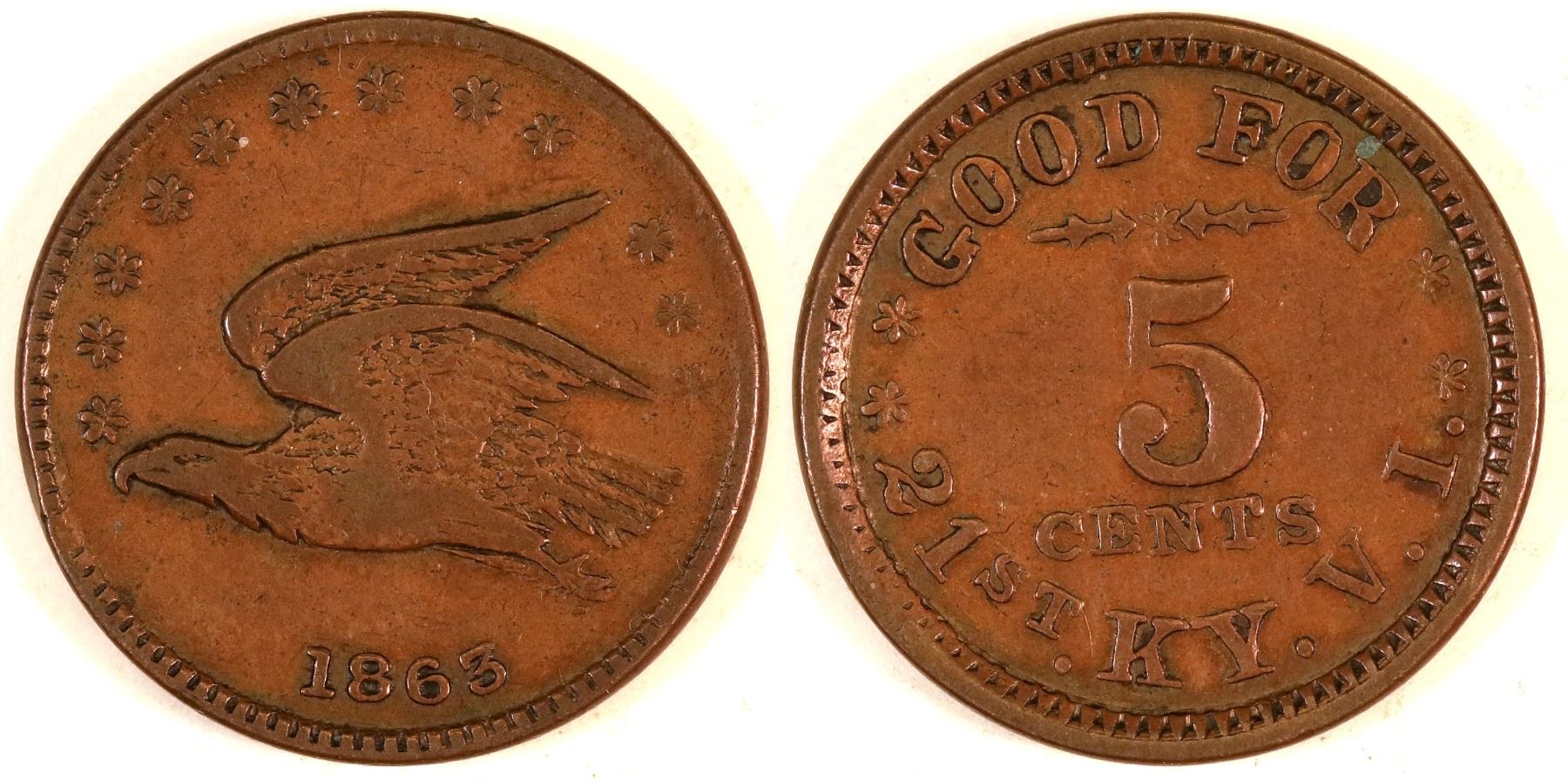 Kentucky sutler token: GOOD FOR / 5 / CENTS / 21ST. KY. V.I. Reverse, flying eagle / 1863. Curto 341, Schenkman KY-21-5C. Copper, 19mm, VF.
