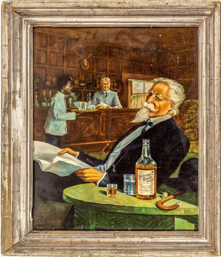 A framed print of a painting of a man in a saloon drinking Kentucky Tavern Whiskey, Frame Size: 27.75" x 21.75" Unknown Artist City: State: Kentucky Inventory Number: 32925