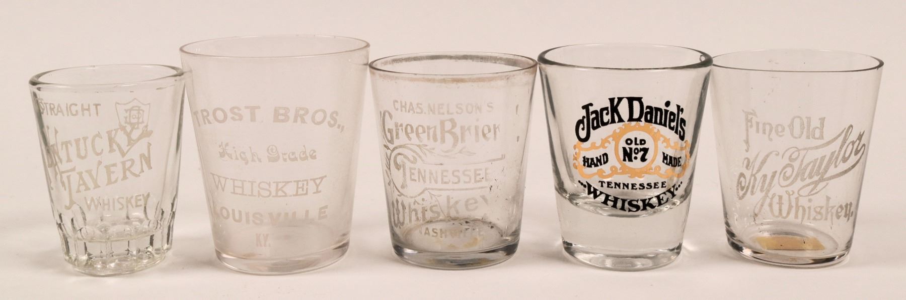 four vintage and one modern shot glasses. Fine Old Kentucky Whiskey; Greenbriar, NAshville; Trost, Louisville; Kentucky TAvern; Jack DAniels (modern).