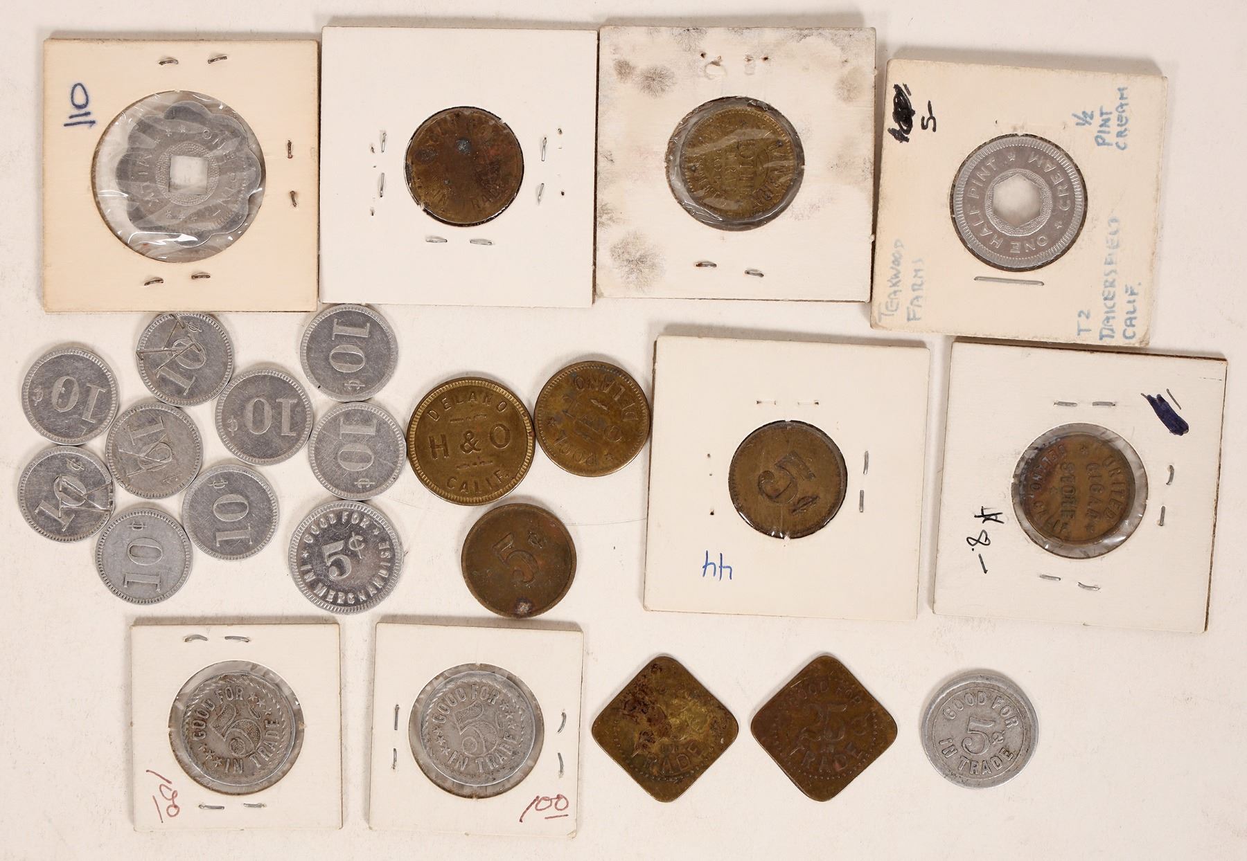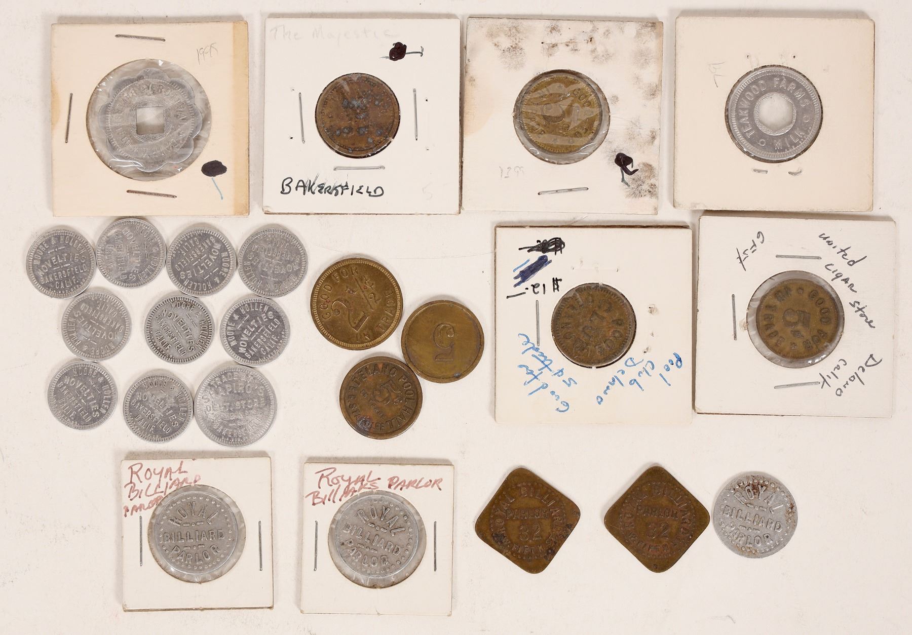 Lot of 25 tokens from Kern County: Royal Billiard Parlor, East Bakersfield mavericks (5); Delano (5) United Cigar Store; Delano Pool Hall; Bakersfield (15): Teakwood Farms; Southern Hotel; Shapiro's Dept. Store; Fruitvale Dairy; The Majestic. [California]