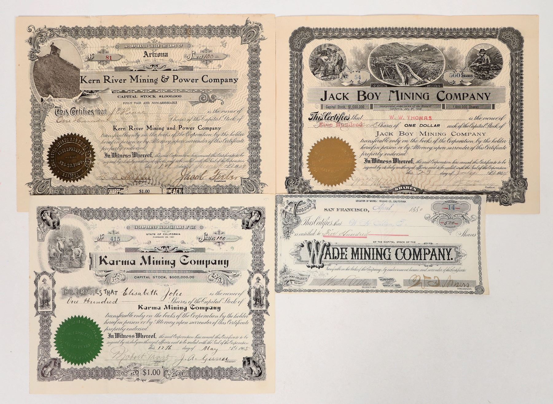 A group of 4 stock certificates from California's Kern, Fresno, and Madera Counties, dating from 1880 to 1905. Stocks in the lot are from the Wade Mining Company, Jack Boy Mining Company, Kern River Mining & Power Company, and Karma Mining Company. All 4 certificates are issued and uncancelled, and have been signed by their company's secretary and president. All but the Wade certificate have embossed company seals. Interesting mining vignettes on the Jack Boy certificate. Some creasing/minor tearing on Kern River certificate.