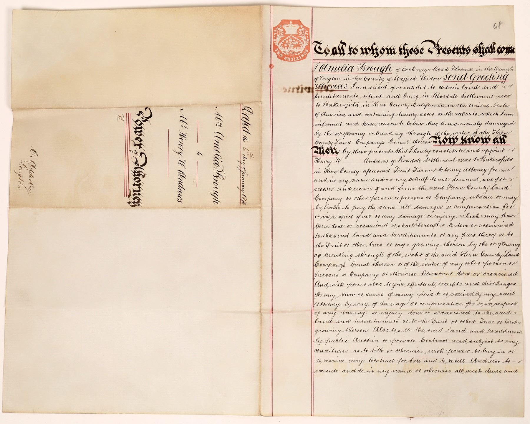 Power of Attorney document (1 piece, folded, no tears, legible, in good condition). Dated 6th day of January 1896. British citizen Mrs. Amelia Brough to Mr. Henry W. Andrews, American attorney. Signed in the Consulate of the United States in England. Document requesting compensation for water damage caused by overflowing or breaking of the Kern River Land Company Canal on some 20 acres of land owned by Mrs. Brough in the Rosedale Settlement near Bakersfield, CA. On parchment paper, no tears, handwriting legible.