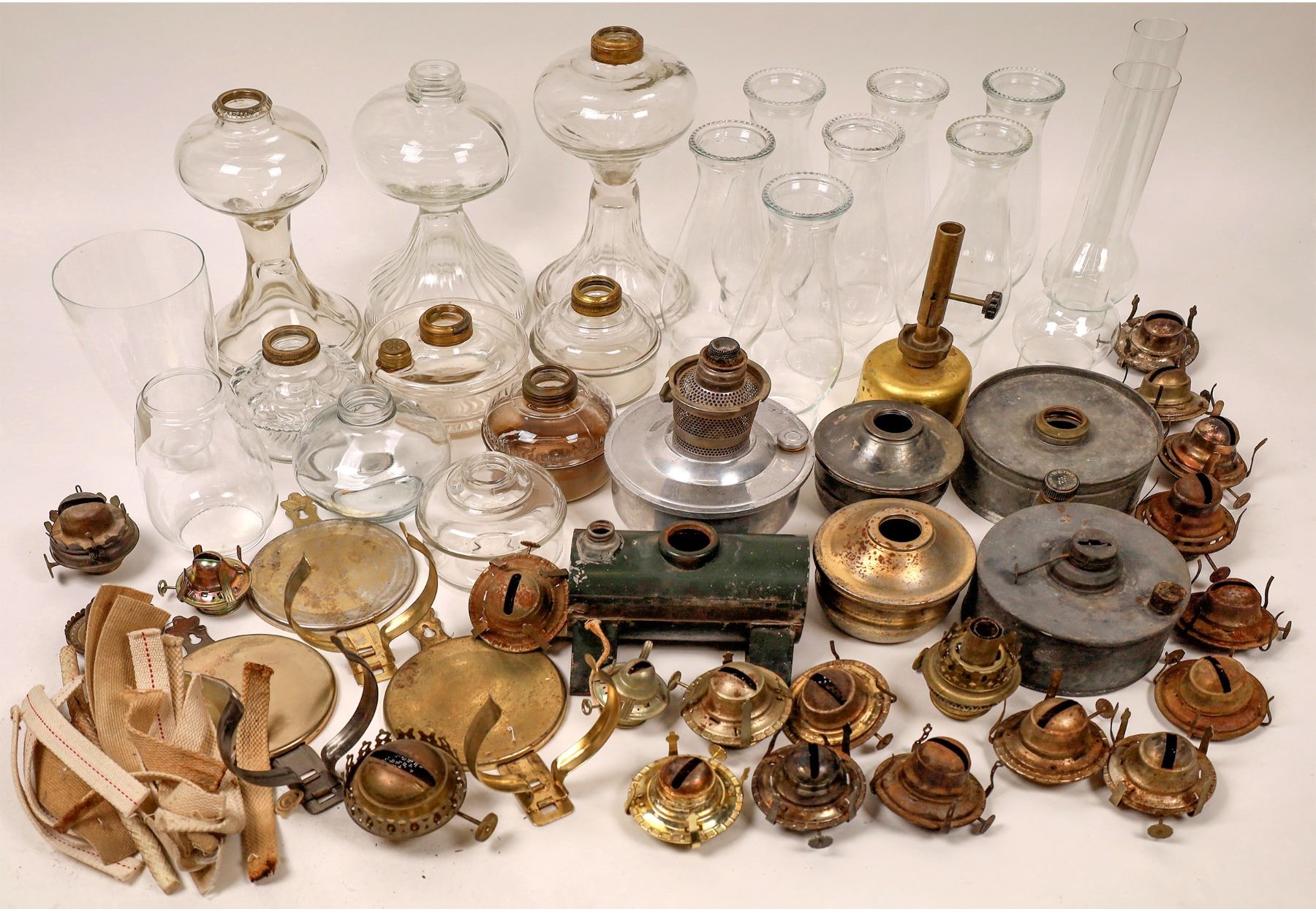 Don't be caught in the dark again with this incredible lot of kerosene lantern parts. There's enough chimneys, bases, wicks to light all the rooms in your house during those pesky blackouts. All you need is right here and it's all in good condition. Please see photos for more detail and condition.
