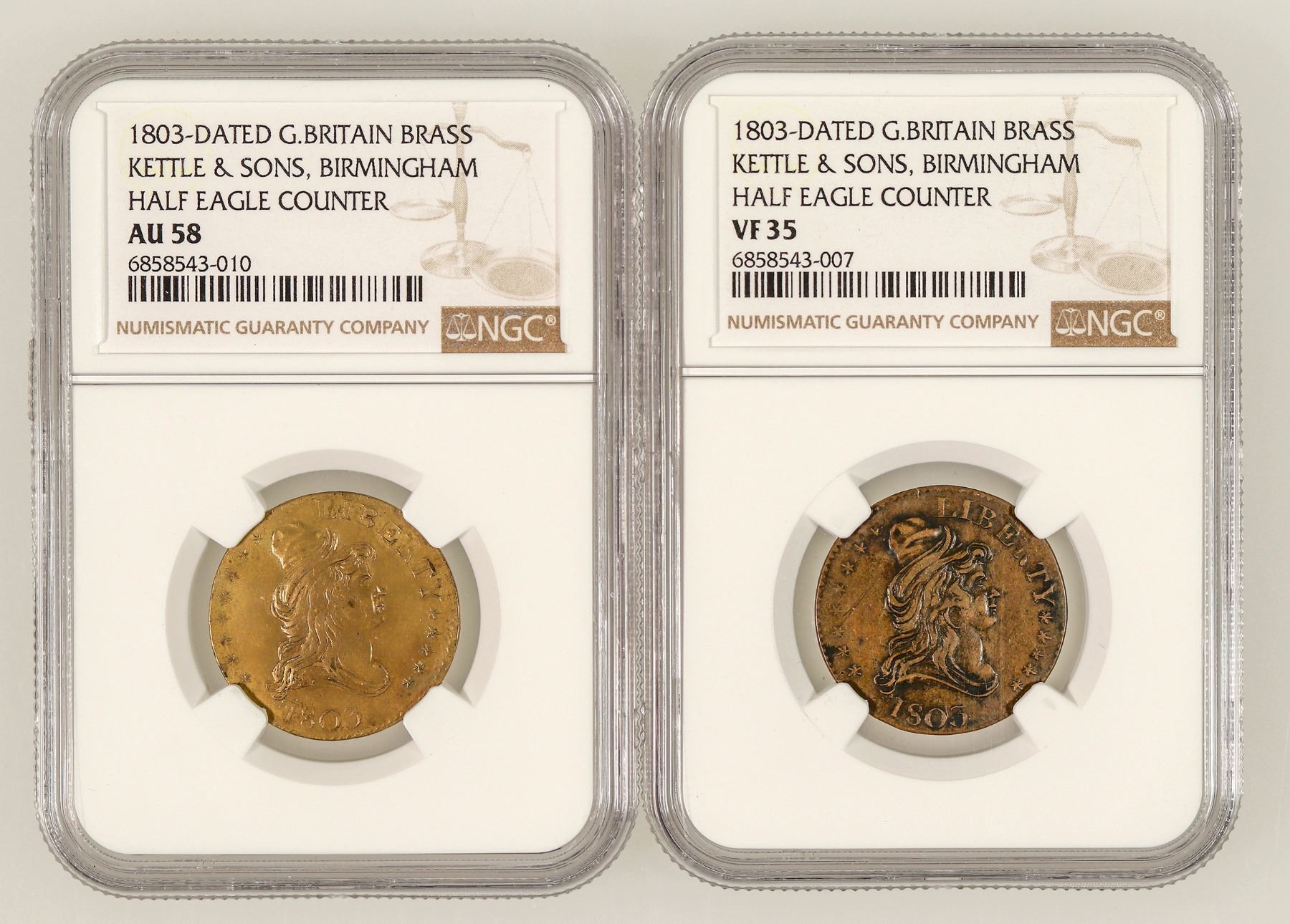 Two NGC certified brass counters made by Kettle & Sons of Birmingham England, in the manner of United States half eagles. FH wrote an essay a few years ago in the L. B. Fauver collection about whether the similarity posed the possibility of counterfeiting U.S. gold. These two examples are graded VF 35 & AU 58 by NGC [ Birmingham United Kingdom