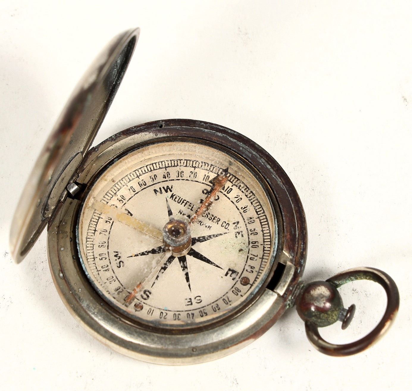 This is a nickel plated Keuffel & Esser Co. (of New York) pocket compass. The case is dent free with some nickel loss front and back. The bezel shows moisture oxidation, as well as some spotting on the inside cover. In non-working condition. It opens and closes properly. C.1910. 1.75 in. in diameter. Please see photo for details.