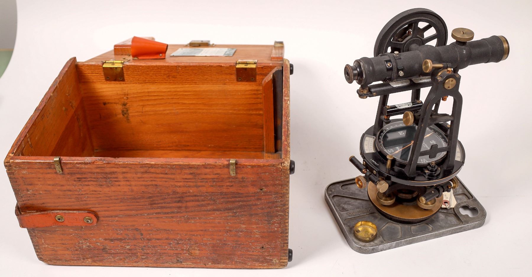 Keuffel & Esser (K&E) surveying transit, model P5137, SN 136307, in its original wooden carrying case. This is a precision piece of optical and mechanical engineering, and at one time, it was a mainstay in the surveying industry. Made to be mounted on a large tripod. It appears that all the pieces except the lens cap are present. The optics are complete, the compass needle hangs freely, all the spirit levels are intact and working, and all the knobs that should turn do so smoothly. You could put this to work right away or proudly display it in your home or office. State: City: Date: Provenance: