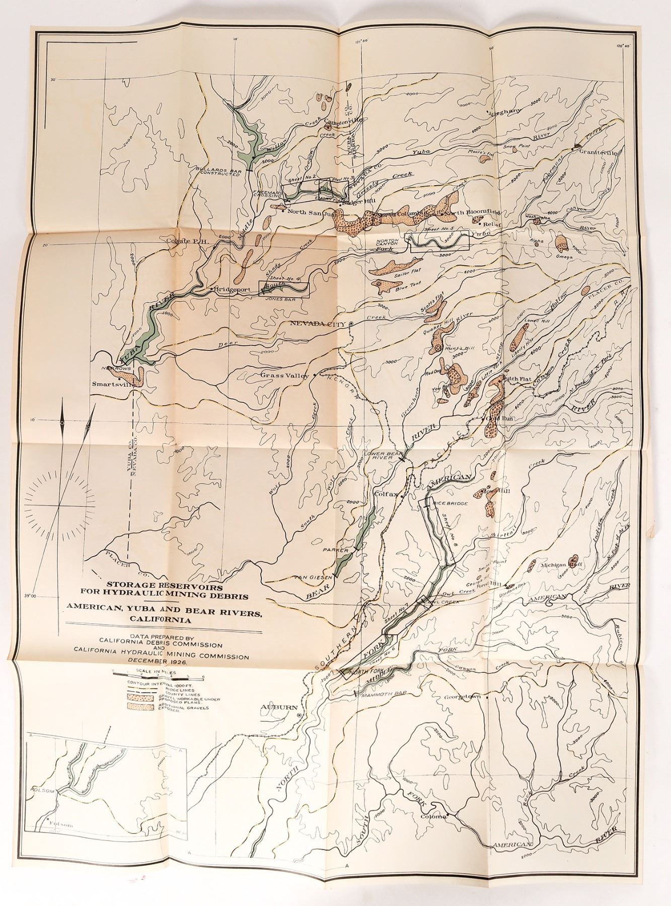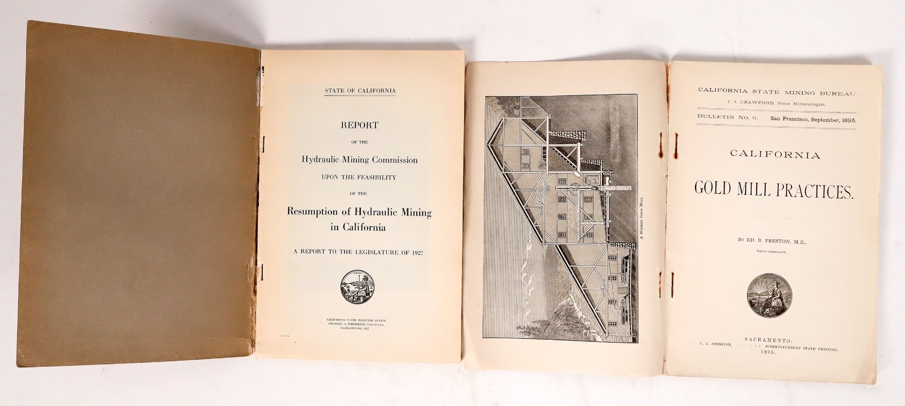 These are 2 key California gold mining publications. 1895 California Gold Practices by Preston, the early development and use of milling equipment during the California Gold Rush up to 1895, 85pp, covers has condition issues. Resumption of Hydraulic Mining in California, 1927, 85pp with detached foldout map, this is a report ot the California legislature in 1927, Yuba, Bear, American Rivers etc. California