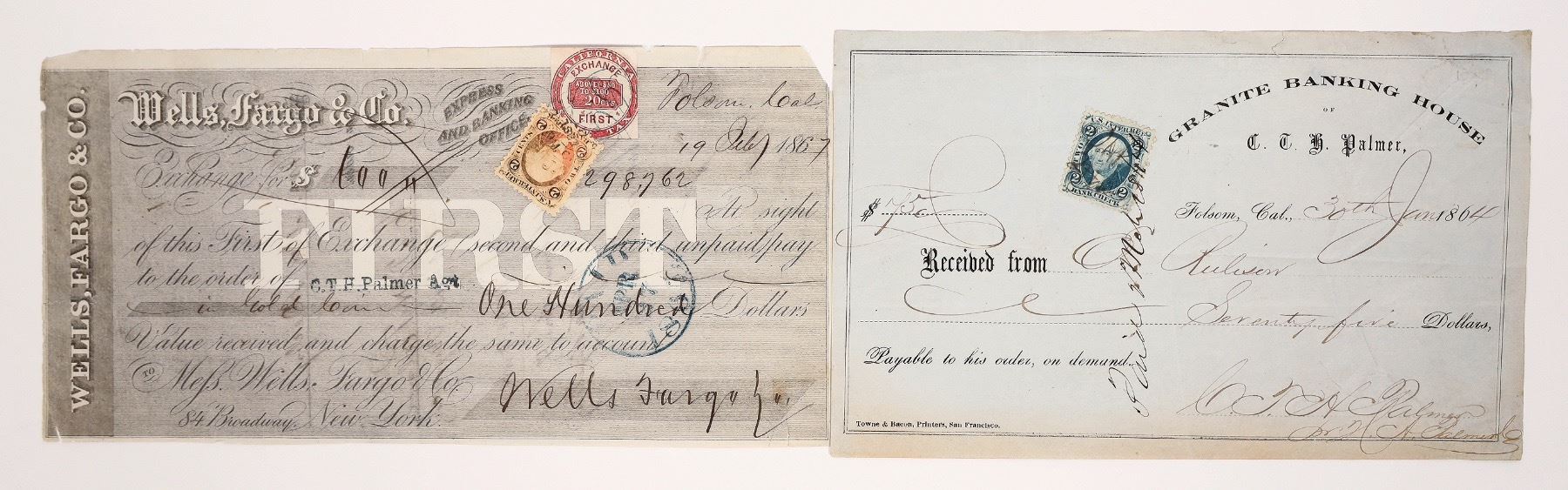 Two key banking documents from the gold rush town of Folsom, located on the American River. A huge amount of gold was mined in and along the American River, with Folsom as the focal point. Towns such as Mormon Bar nearby mined millions in placer gold. Gold Rush banker C.T.H. Palmer ran the Granite Banking House at Folsom, and was also the Wells Fargo agent. A Jan. 30, 1864 receipt from that bank is here. Also present is a Wells Fargo First of Exchange issued to C.T.H. Palmer, 1867 with a red California 20c First of Exchange state revenue stamp. Both items are very rare.