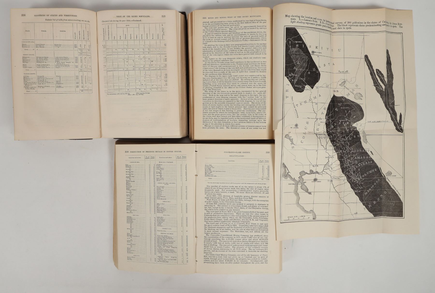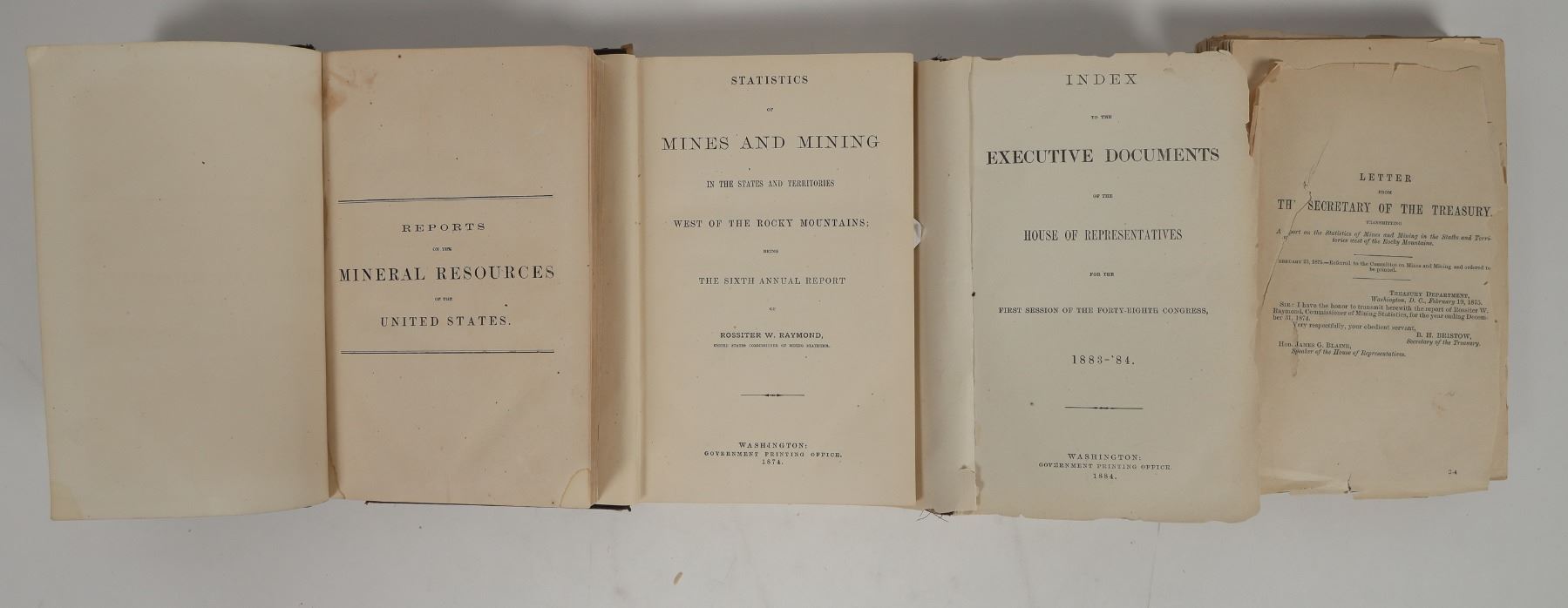 Four, heavily used key mining references from the Fred Holabird Collection. Includes: 1) Statistics of Mines and Mining in the States and Territories West of the Rocky Mountains; Being the Sixth Annual Report of Rossiter W. Raymond, 1874.585 pages w/index. 2) 1875 Condition of the Mining Industry, missing cover, 540 pages. 3) 1868 J Ross Browne Mineral Resources of the United States 674 pages bound with 1868 James W. Taylor Mineral Resources East of the Rockies 71 page with index. 4) 1884 Burchard Report of the Director of the Mint from 1883. 853 pages, missing covers. See photos for condition. Invaluable mining reference group from Fred Holabird's office.