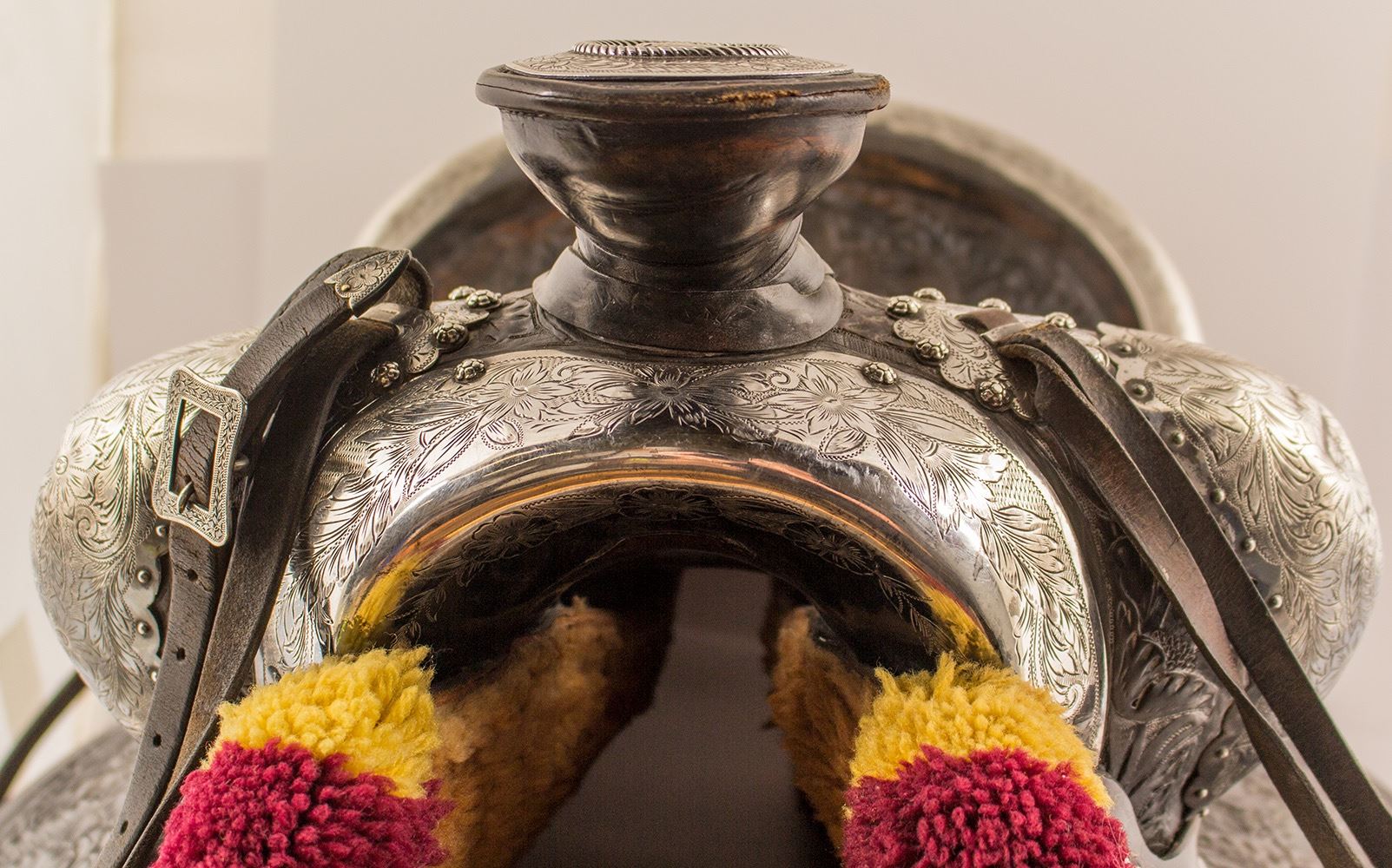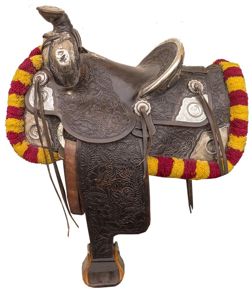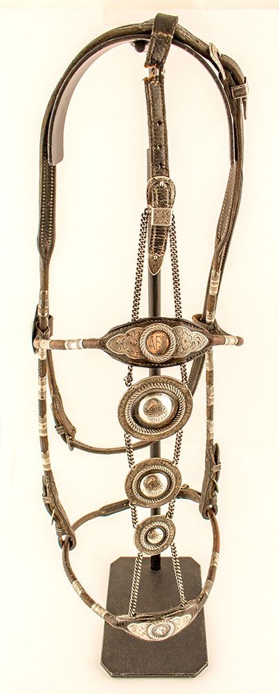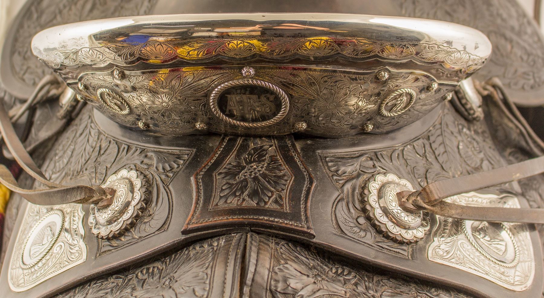 Beautiful silver parade saddle with matching parade-style headstall made by Keyston Bros. in San Francisco, with silver work by Schaezlein, one of the finest of the San Francisco silver men for saddlery. Circa 1930's (pre-1950). Silver ornamentation all over that contains horsehead with rope border, resembling a medallion. These special silver emblems are seen on the silver corner plates, rear plate, and on the silver horn cap. Classic Keyston silver with gold plate emblem at head of seat. Black stained leather artistically tooled with floral patterns (hybiscus, etc). Gold and maroon corona. Tie strings at four locations each side, as usual. One silver concho missing from brow band. Both silver swell caps have edge dents, typical of use. The headstall has 3 cracked leather sections. From the Cowboy Connection Collection, Livingston, MT. State: City: Date: ID# 49060