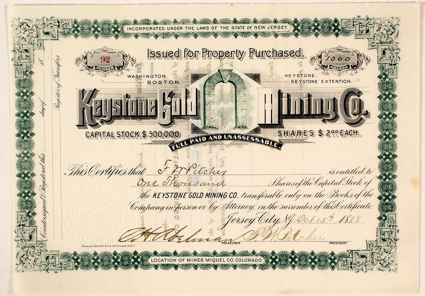 Inc. in New Jersey. No. 92, issued for 1,000 shares to FW Pitcher, company president, on Oct. 15th, 1888. Signed by Pitcher and also the secretary. Not cancelled. Vignette of green arch with keystone. Mine properties listed above logo: Washington, Boston, Keystone, and Keystone Extension. "Location of Mines Miquel Co. Colorado" printed at bottom. Pinholes, folds, very fine. 8 x 11.25" Burchard (1881) reports them developing flumes for washing on an extensive scale. In 1882, he reports that the Keystone placers have been continually operated with successful results. (Al Adams Gold Rush Memorabilia Collection) Date: Location: San Miguel County, Colorado HWAC# 59063