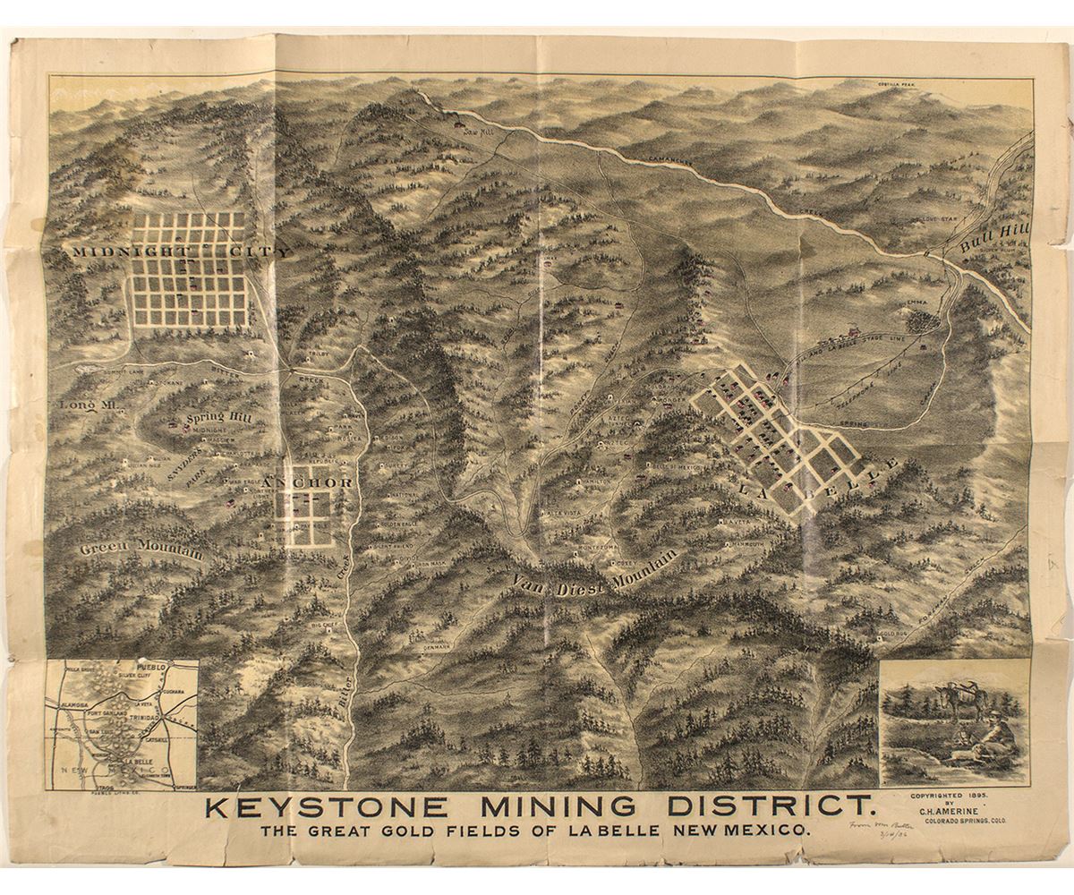 Beautiful bird's eye map shows the Great Gold Fields of La Beille, New Mexico, by C. H. Amerine, Colorado Springs, Colorado. Measures 22" H x 28" W. Reverse has pencil sketch of claims. Map is hand-drawn lithograph that shows mines, creeks, towns, trees and ranges. Lower left corner has an inset of La Belle area, towns and railroads. Lower right corner has an inset that depicts a miner at a campfire aand his pack mule. Printed by Pueblo Litho. Co. La Belle (historical) - Mining town eight miles northeast of Red River which had a post office from 1895-1901. As a gold mining camp, it was named after Belle Dixon in 1894 who was the wife of one of the original investors in the mining area. Within one year there were eighty buildings and six-hundred residents (which included twelve women – wives of miners). Gold finds were disappointing and it was abandoned. By 1910 there were only ten miners. Today, the ruins are very difficult to find. La Belle is also the name of the gold and silver mining district.