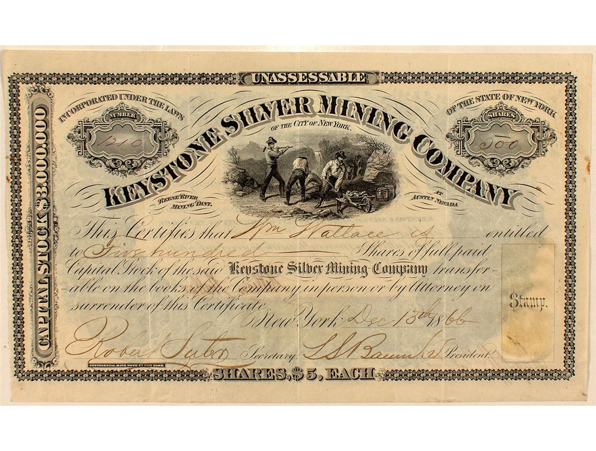 Cert. #1210, issued at New York in 1866. Incorporated in New York. Reese River Mining Dist., at Austin, Nevada printed on the masthead. Issued to William Wallace for 500 shares. Signed by Robert Suter as secretary and L.S. Bauer as vice president. The company controlled 3-4 mines in the area including the “Scottish Chief” on Lander Hill which was the most promising. Ores from the mine ran $200-500 per ton. In addition, the company built a 20 stamp mill on the southern slope of Old Emigrant Canon within a mile of Austin. Uncancelled. VF.City: AustinCounty: LanderState: NVDate: