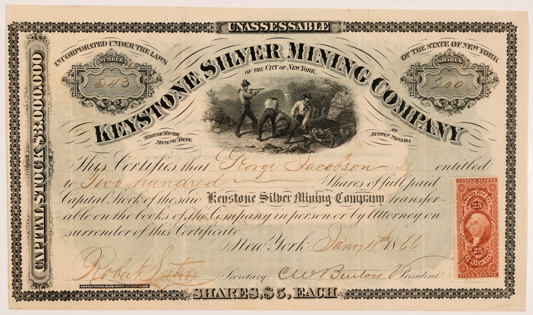 "Reese River Mining Dist. at Austin, Nevada" (printed under vignette). Inc. in New York. No. 543, issued for 200 shares to George Jacobson on Jan. 11th, 1866 in New York. Signed by vice-president CW Burton and secretary Robert Suter. Not cancelled. Black border and print, vignette of miners working on the surface. Printed by Continental Bank Note Co., New York. 25 cent US IR stamp attached at bottom right. 5.75 x 9.75" Many folds. Browne (1868) notes that the Keystone Mill "may be taken as a sample of its class, from its arrangement, construction, and class" (pg. 402). He also lists production for the quarter ending Dec. 31, 1866 as 2 tons, 350 pounds, averaging $194.66 per ton (pg. 404). Ken Prag Collection