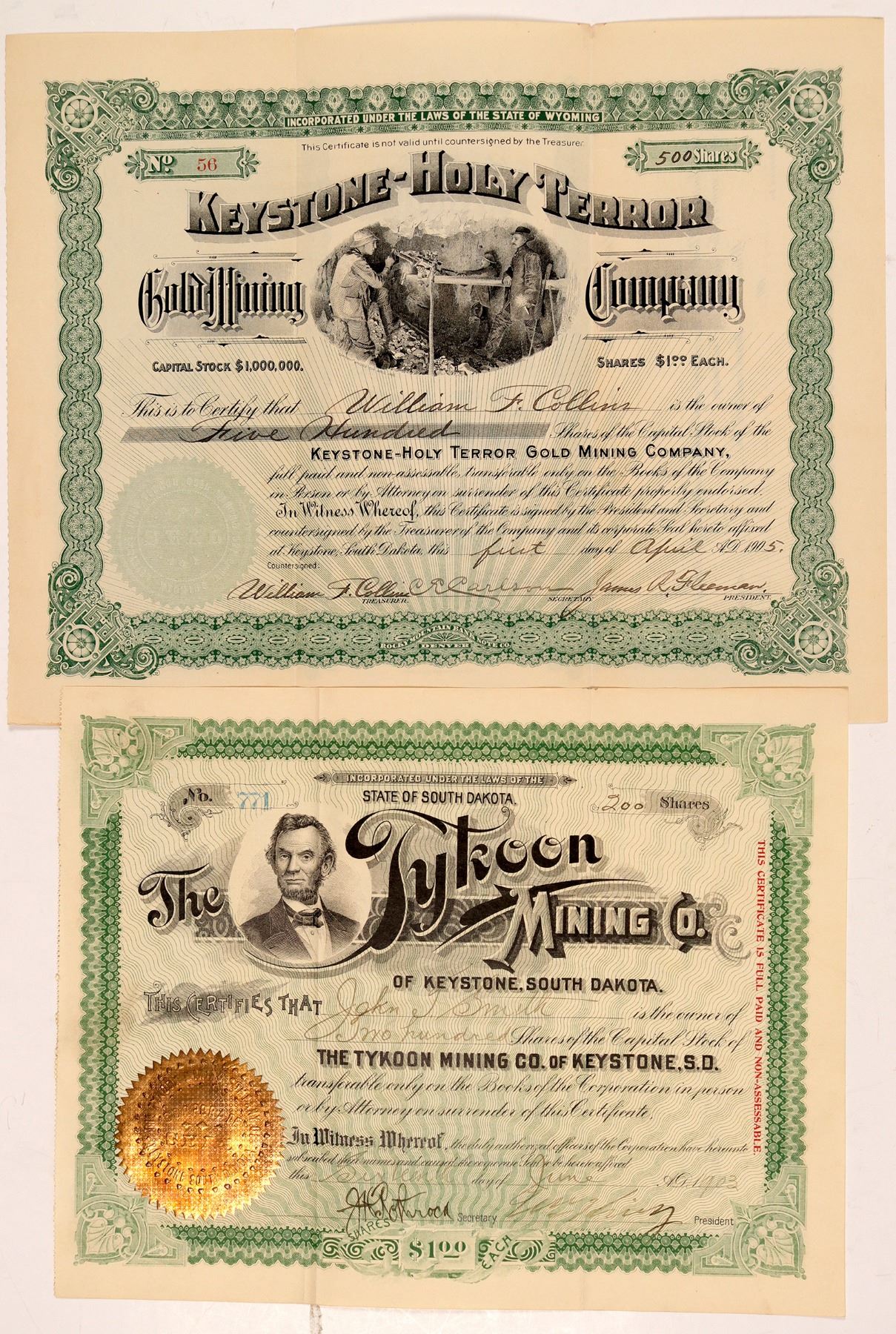 The Tykoon Mining Company of Keystone, South Dakota, I/U No. 771 for 200 shares to John J. Smith signed by president (illegible signature); Keystone-Holy Terror Gold Mining Company I/U No. 56 for 500 shares to William F. Collins, President James R. Fleeman signature.