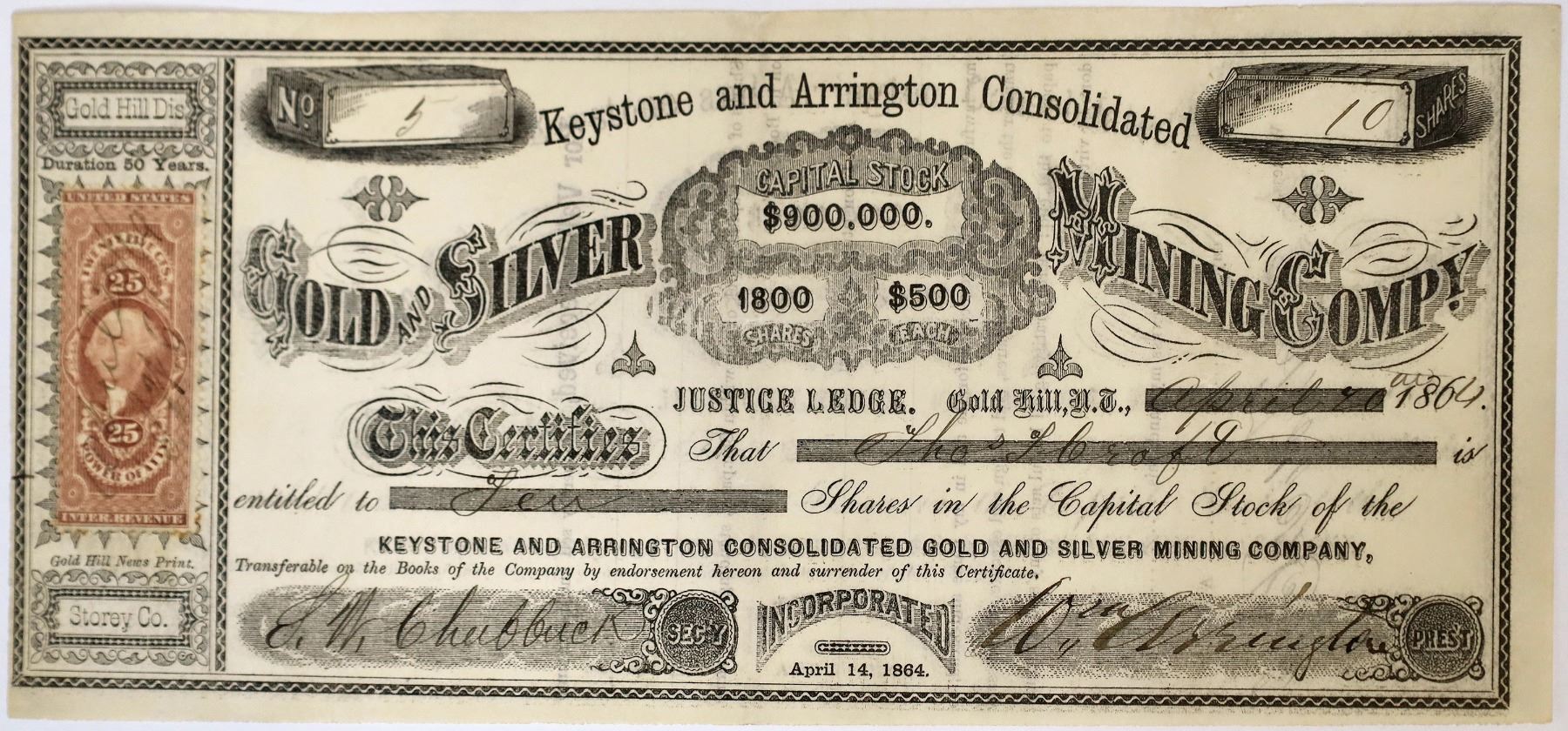Arrington was an incorporator of the Virginia, Carson & Truckee RR in 1862. #5 for 10 shares to Thomas Craft. Signed by Chubback and William Arrington. Dateline Gold Hill 1864. Incorporated April 14, 1864. Not cancelled. 25c Power of Att'y revenue stamp. Gold Hill News Print. Location: Gold Hill District, Justice Ledge. Nick top right. Slight wrinkles. Otherwise fine. From the 1864 Collins Directory: William Arrington is listed as a stock broker in the Medan Building and not to be confused with N.O. Arrington, territorial banker. There is also a William Arrington listed on Capt. A. McDonald's Virginia Volunteers roll as being "mortally wounded" in the Pyramid Lake Indian War of 1860. A relative of our Arrington? S.W. Chubbuck was secretary for numerous mining companies. Signed by Samuel Chubback and William Arrington. Croft was secretary to several Comstock mining companies in 1863. He seems to have disappeared in 1864. Chubback was also secretary to many mining companies and the Gold Hill post office for nearly 20 years. Arrington was a stock broker. This is a consolidation of the Keystone and Arrington mines. Notes on Croft, Chubback and Arrington included. Abstract of Gold Hill News about the company included.