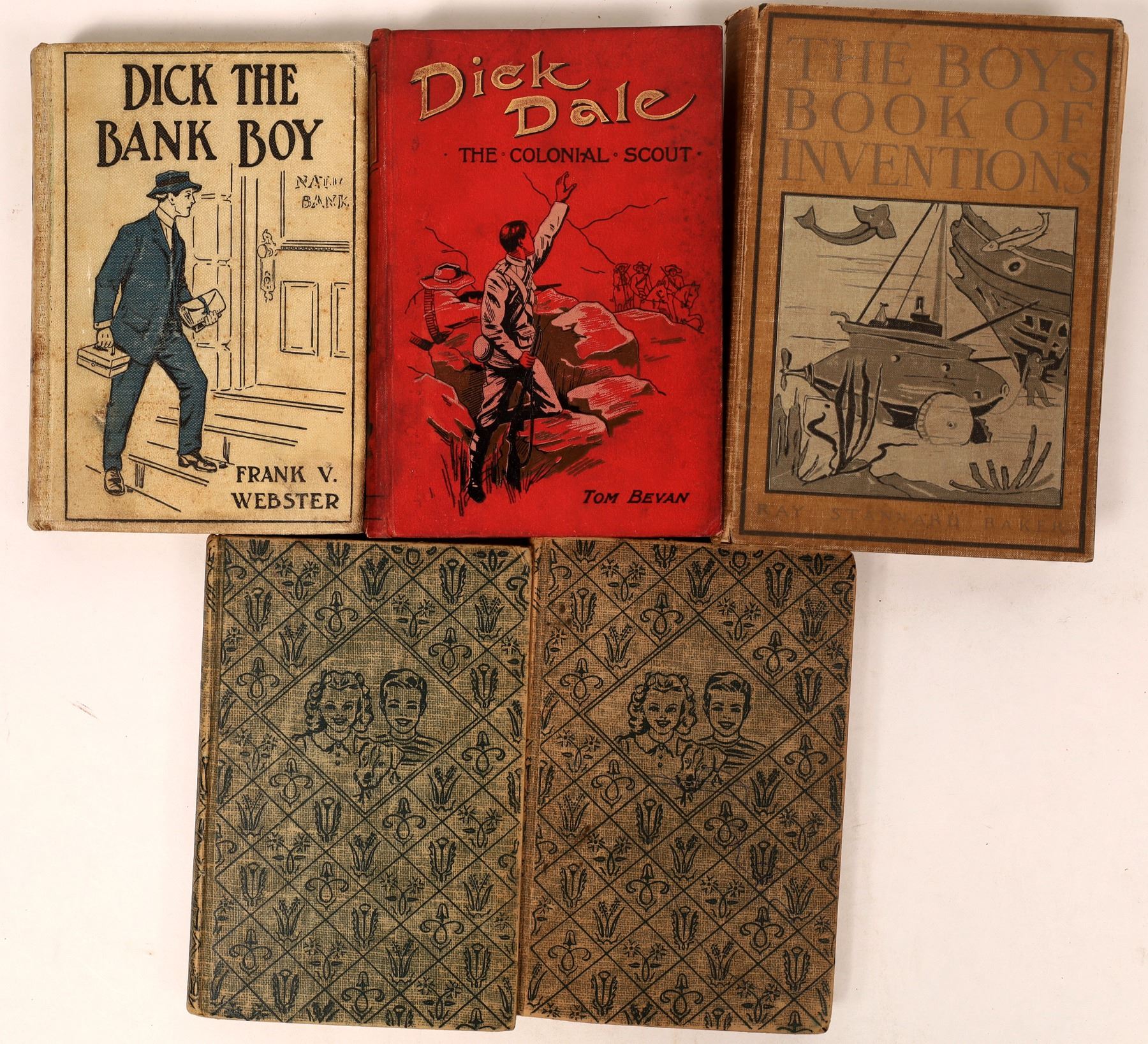 These are five volumes of kids' adventure novels for the first half of the 20th century. All are in about the same worn condition, but all have their boards intact, although there are some bindery issues with one or two. Title include, "Dick Dale, The Colonial Scout," "The Boys Book of Inventions," "The Bobsy Twins" (2) and "Dick the Bank Boy."