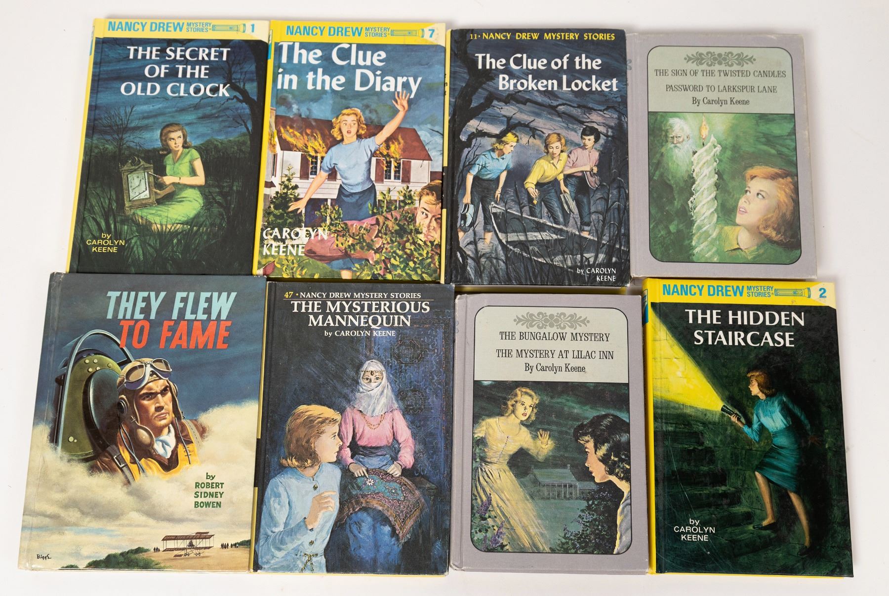 They Flew To Fame by Bowen. The Mysterious Mannequin by Keene. The Bungalow Mystery by Keene. The Hidden Staircase by Drew. The Clue of the Brocken Locket by Keene. The Sign of the Twisted Candles by Keene. The Secret of the Old Clock by Keene. The Clue in the Diary by Keene.