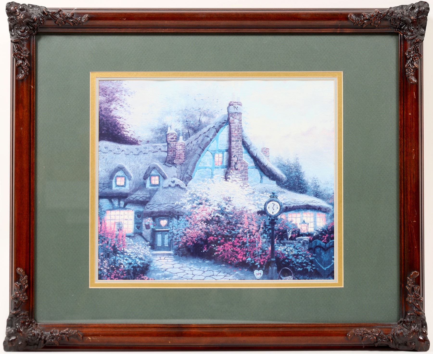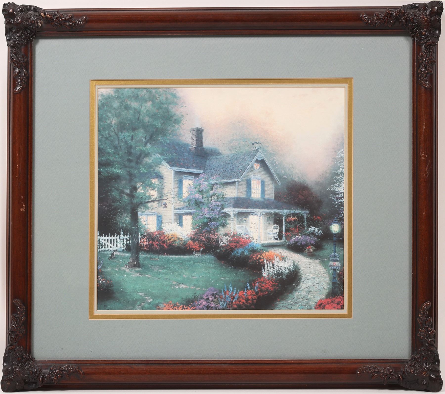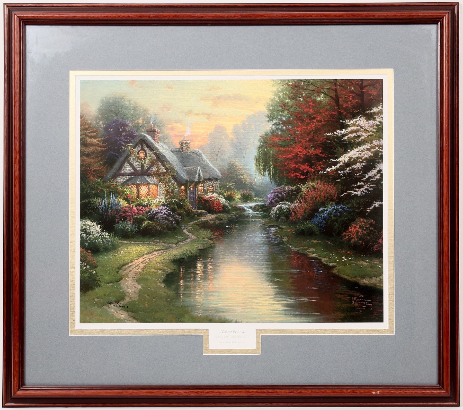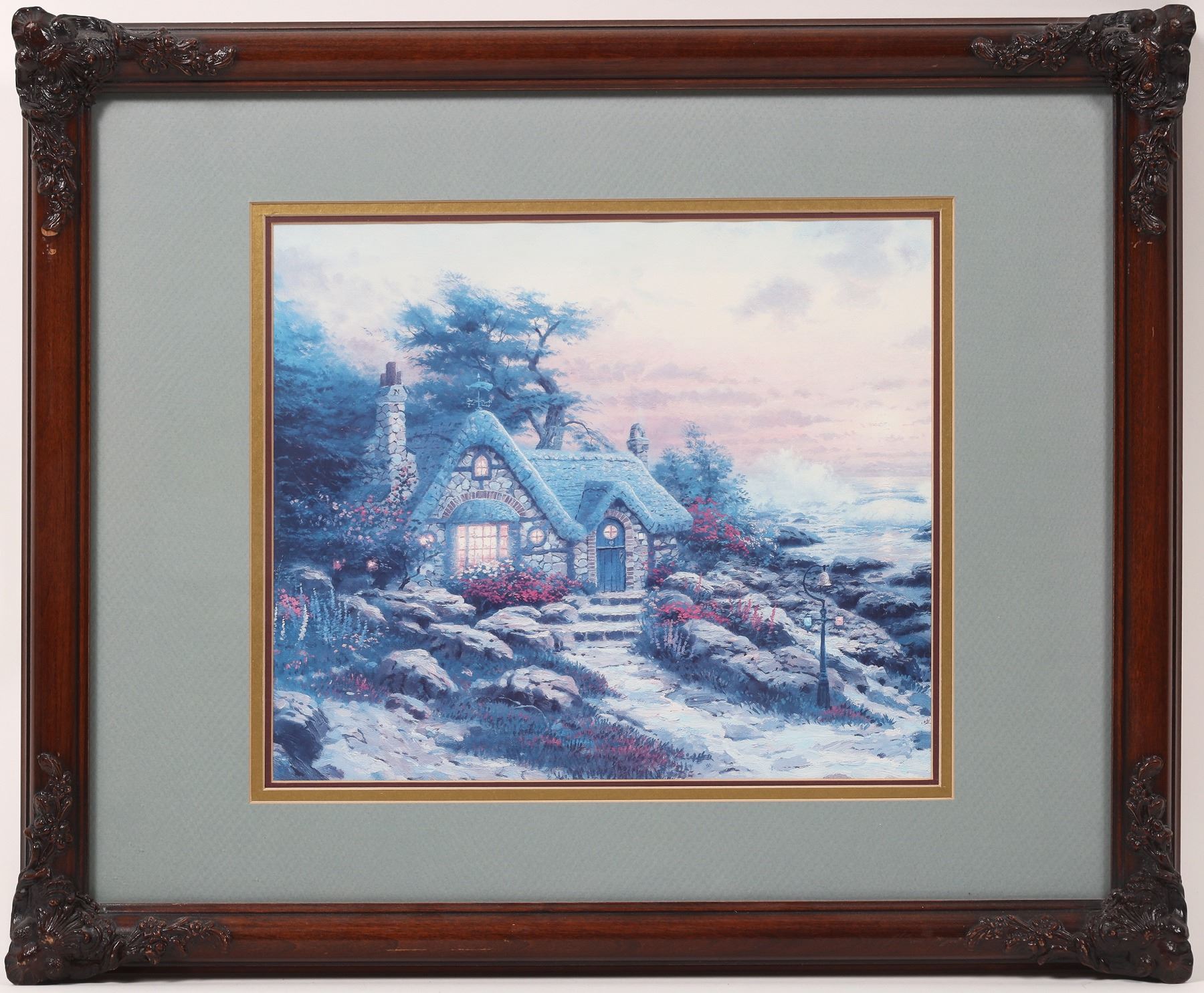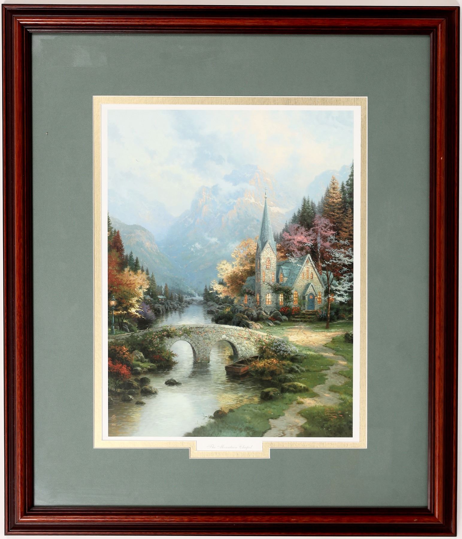 Six different Thomas Kincaid artistic and professionally framed prints. 1. "A quest Evening" signed at lower left, 3204/3550, image: 20" x 16.5", frame 26 x 29", very fine. 2) "The Mountain Chapel, unsigned, frame 25 x21", very fine. 3) "Forest Chapel", unsigned, frame 21 x 25", very fine; 4, 5, and 6 are all the same size3, in identical ornate frames, but unsigned. exterior dimensions 22 x 18". No titles shown, all very fine.)