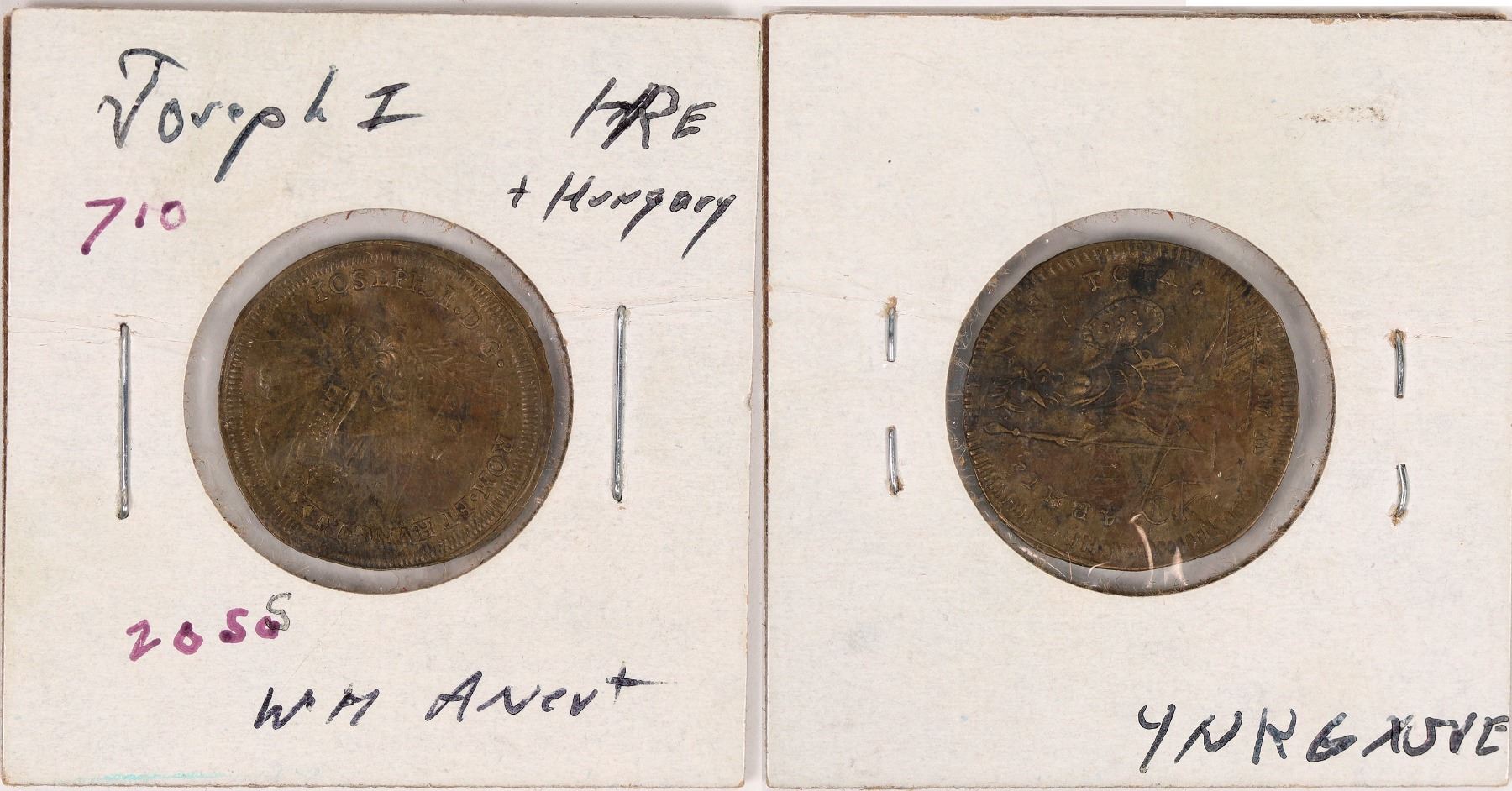 Brass token. Joseph bust facing right obv. Reverse: Man holding spear and shield. Joseph Jacob Ignacio Johann Anton Eustachius, 1678-1711. Crowned King of Hungary 1687 age nine and in 1690 crowned King in Germany age 11. Upon fathers death succeeded to thrones of Bohemia and Holy Roman Empire.