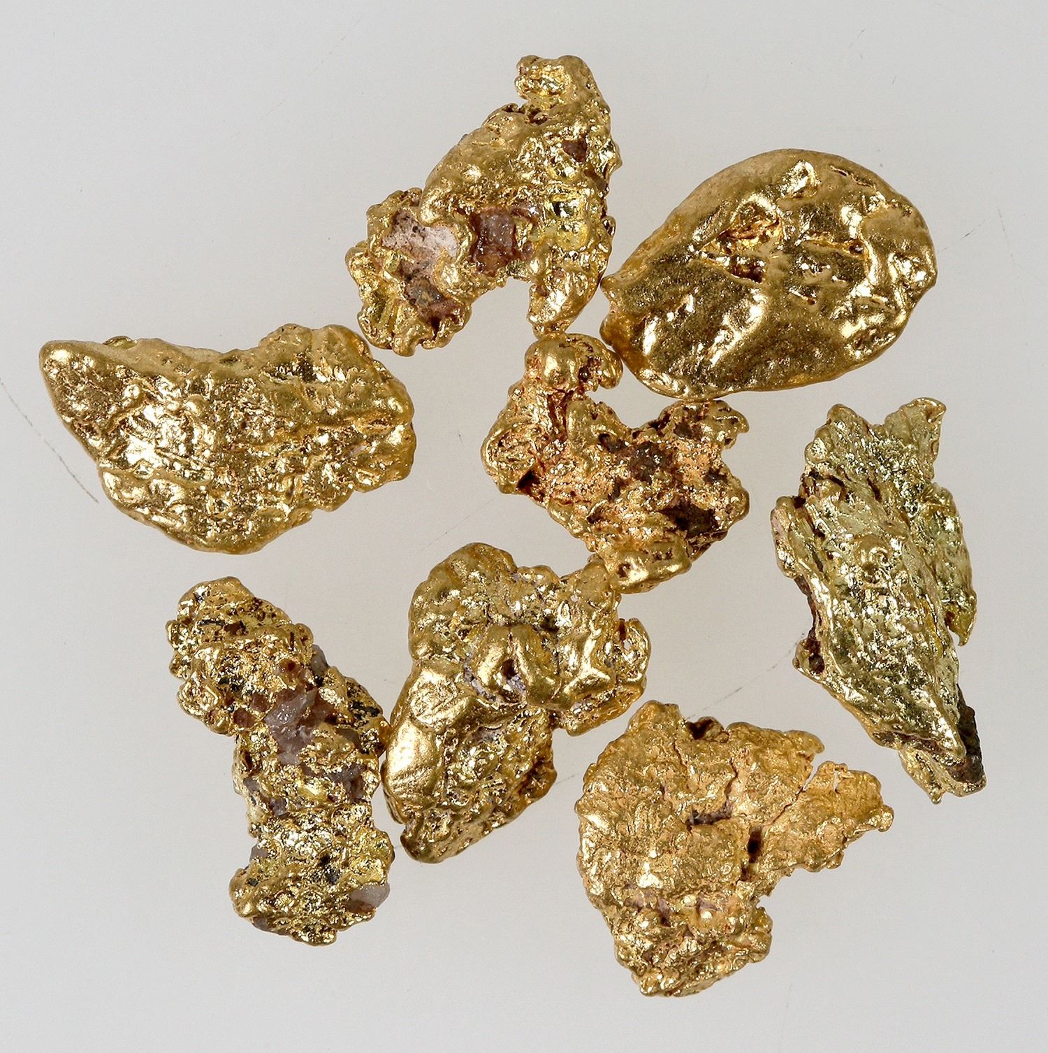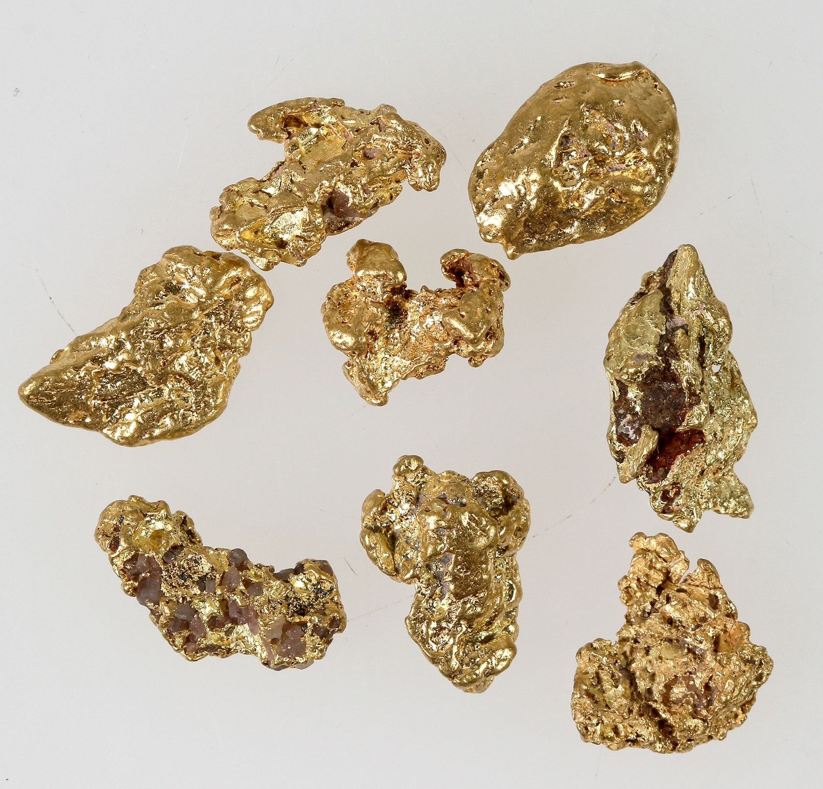 Eight small gold nuggets from the King tut placer mine, Meadview, Arizona. Part of the expanded Lost Basin Mining District. Total weight of 7.9 grams; about 8-12 mm each. Mined in the 1934-1942 period. It is a thin placer unit extending for about 8 miles and is only about two feet thick. It is a favorite spot for metal detectorists and dry wash specialists.