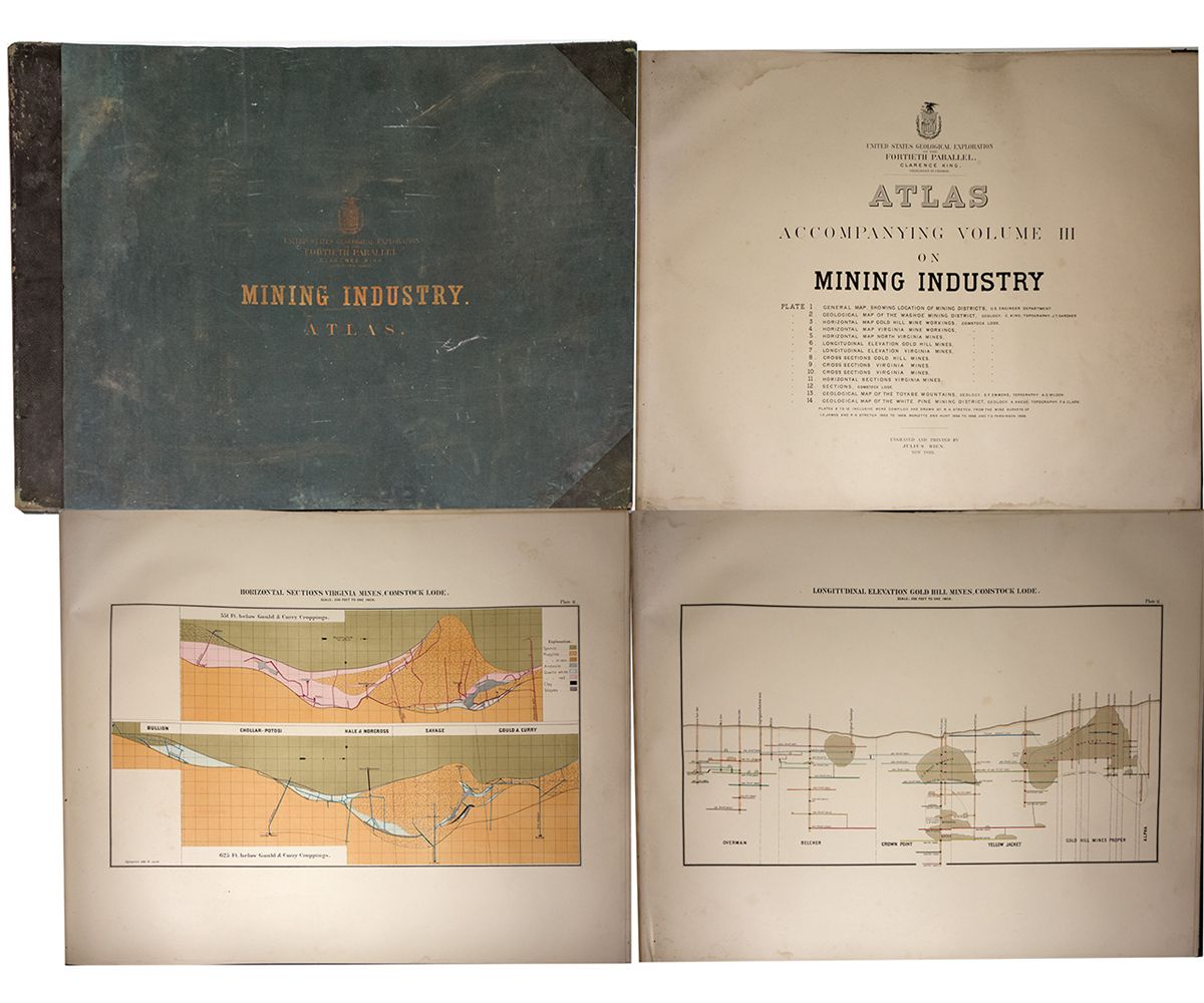 Mining Industry Atlas. Clarence King. 1870. Atlas to accompany the Mining Industry Volume III of the US Geological Explorations of the Fortieth Parallel. 19.5 x 25", typical original green boards, little to no wear. This is one of the most important mining industry atlases, as it is very early and shows the development of several key mining districts in Nevada, especially the Comstock. One of the first plates is that of the White Pine, or Hamilton/Treasure City region. What follows is the first attempt at consolidating all of the data (survey and geology) from the great Comstock Lode, later detailed by Becker in the early 1880's. For those of us lucky enough to have worked on the Comstock, this is a prized atlas.City: County: StoreyState: NVDate: 1870