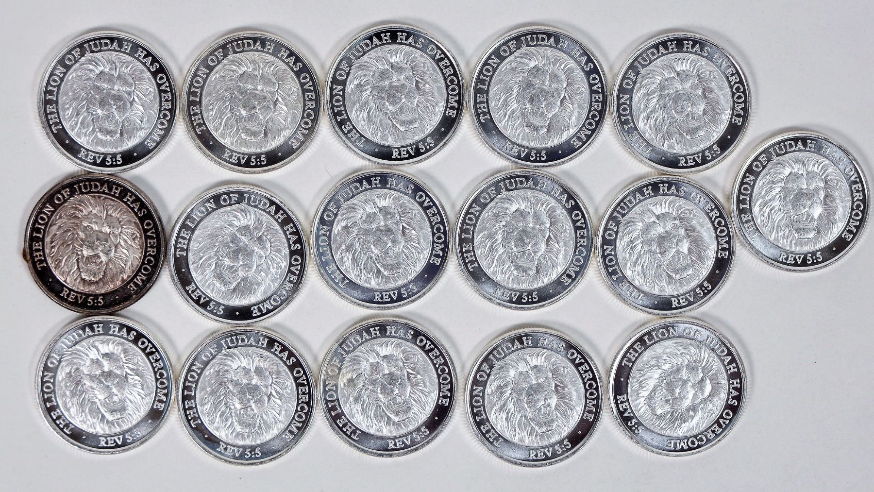 Uncirculated roll of 16 silver 1/2 troy ounce "Kingdom Shekel" coins. Created by Tsiyon.org ("Tsiyon Road Messianic Radio") The Silver Kingdom Shekel was designed and commissioned by Eliyahu ben David on behalf of Tsiyon. The obverse face of the Kingdom Shekel celebrates the overcoming Lion of Judah of Revelation 5:5. Who has taken the Scroll out of the right hand of the Father and has begun to remove its seals. The reverse face of the Kingdom Shekel illustrates the prophesied gathering of the faithful remnant of the Twelve Tribes of Israel into a unified Kingdom nation, manifesting the glory of YHWH in the Earth. 30 mm. The top coin has some toning on the obverse, the rest are brilliant uncirculated.