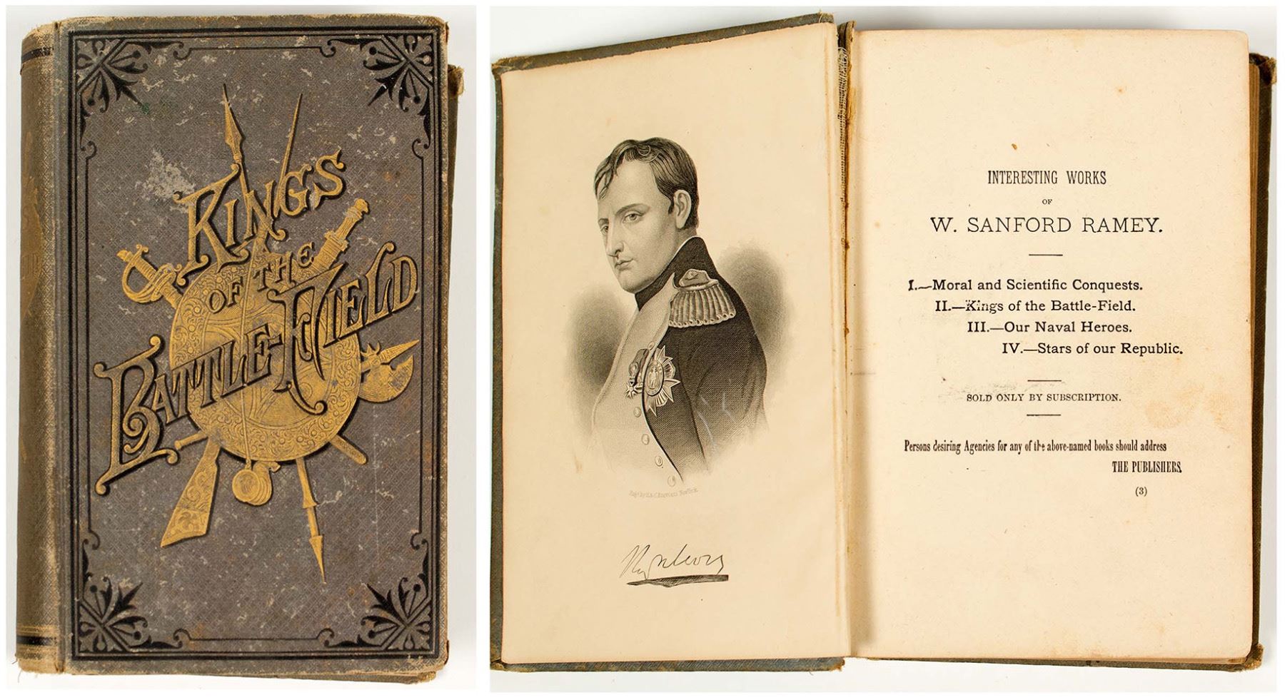 Kings of the Battlefield by W. Sanford Ramey, Illustrated, Philadelphia: Aetna Publishing Co., 1884. This piece is 525 pages and covers: I Napoleon Bonaparte, II Chavazier Bryard, III Alphonso of Spain, IV King Richard (Lion Hearted), V William Wallace, VI Robert Bruce, VII Francis Pizarro. VIII John Churchill, IX King Charles, X Frederick William, XI Gilbert Motier Lafayette and many others including American Generals Washington, Greene, A. Jackson, Grant, Sherman, Meade, Lee, Jackson and Custer. Missing title page, covers very scuffed and binding starting to loosen. Foxing and toning. Date: 1884 Location: United States HWAC# 43519