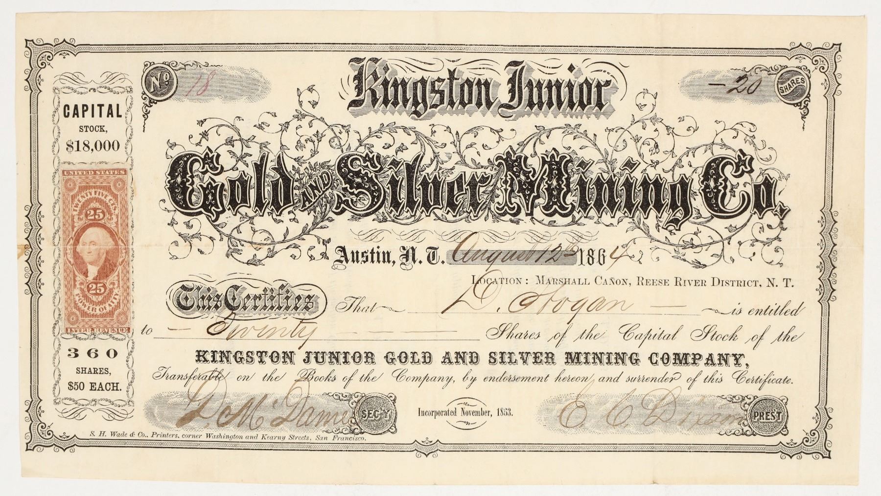 I/U. Kingston Junior Gold and Silver Mining Co. Stock, issued 1864. Located Marshall Canyon, Reese River District, Austin, Lander CO. N.T.. 25c revenue stamp left side. S. H. Wade & Co. printer. No tears, folds or holes. Marshall Canyon was roughly one mile south/southwest of Stokes Castle in Austin. I found no information on the Kingston Junior. Marshal Canyon, shows croppings and dykes throughout and warrants the most thorough development. It is possible this section will make mines equal to those on Lander Hill - after its ore bodies are located. [Mining Investor] D. Hogan worked at the Savage Mine in the Reese River district [1866 Austin Directory]. In 1861 Edward C. Dixon was appointed Justice of the Peace in Carson City. Later that year he was appointed probate judge for the newly formed Ormsby County, Carson City on December 14, 1861. He held this position until July of 1863.