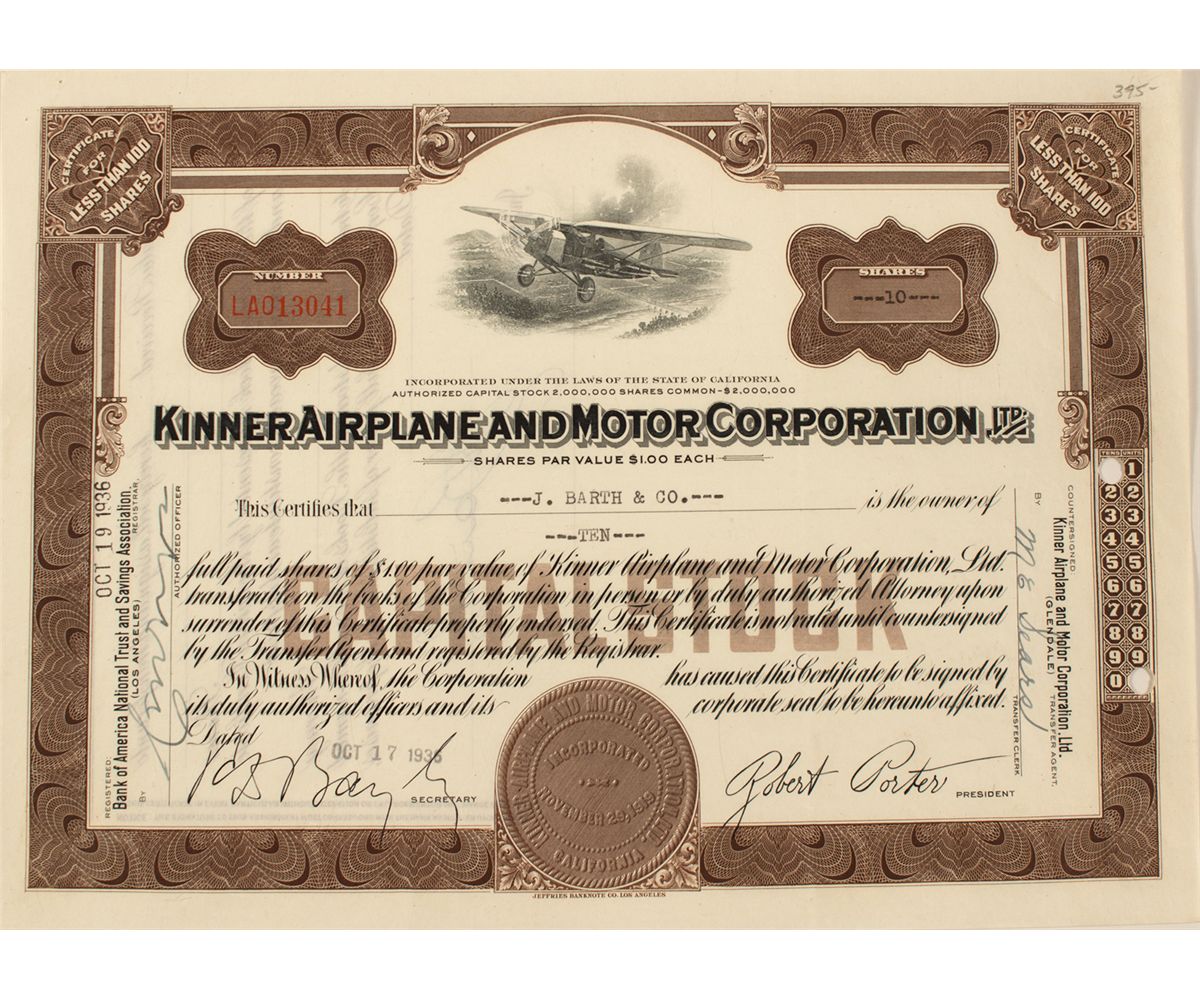 Incorporated under the laws of the State of California, No. LA013041, issued for 10 shares to J. Barth & Co. on October 17, 1936. signed by Robert porter as President and J. Bartel as Secretary. Winfield Bertram “Bert” Kinner founded the company in 1919 to produce radial engines as well as light general and sports aircraft.