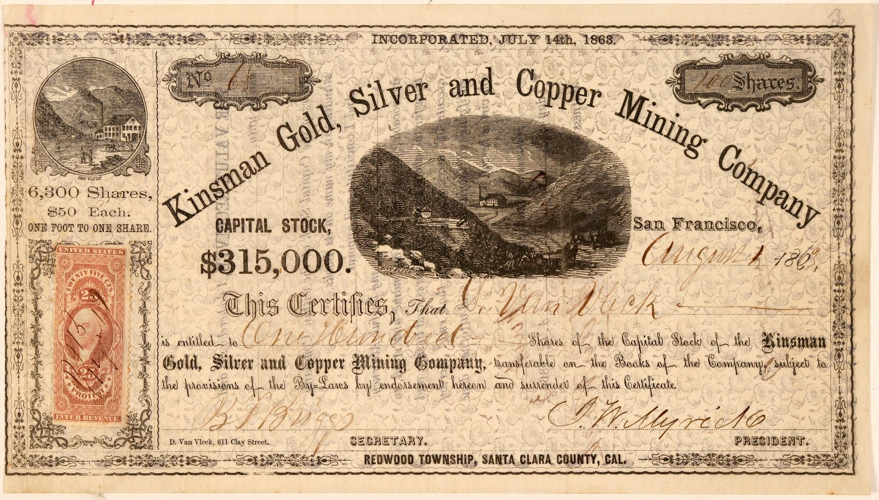 Issued to the engraver of the stock's illustrations! Redwood Township, Santa Clara County, Cal. (printed at bottom center). Inc. July 14th, 1863. No. 68, issued for 100 shares to D. Van Vleck on Aug. 21, 1863 in San Francisco. Signed by president JW Myrick and secretary B. Briggs. Not cancelled. Black border and print. Gray background. Two mining vignettes by Van Vleck! Durbin Van Vleck is listed in the 1863 SF Directory as a wood engraver at 611 Clay Street (info confirmed on the stock). 25 cent adhesive IR stamp attached on the left. Signed by Van Vleck on the reverse. 5.25 x 9.75" Left border trimmed close. One small red stain. Not in Filer or Holabird indexes. No additional info found on CDNC. The Redwood township was bounded on the north by Fremont and Santa Clara townships; on the east by Almaden township; on the south by Gilroy township, and on the west by Santa Cruz county. Van Vleck (1833-1898) engraved the California grizzly bear on the Anchor California Lager label, courtesy of The Bancroft Library, UC Berkeley. First published in 1856 in San Francisco, it is a superbly crafted rendering of an original illustration by Charles Christian Nahl (1818–1878), who had painted both eastbound and westbound versions of this bear. We have sold other Western mining stocks with lithographs by Van Vleck. Ken Prag Collection
