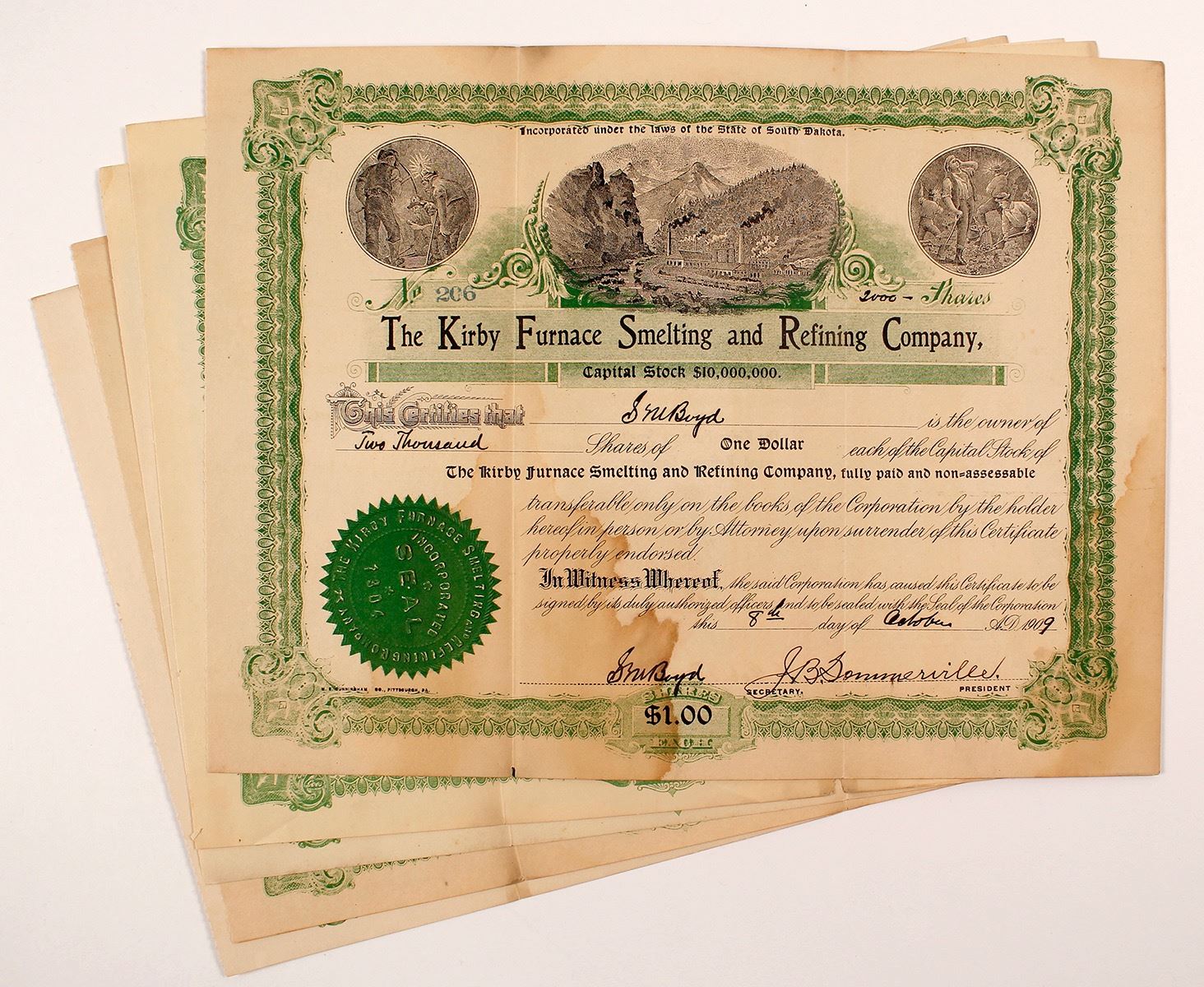 Cream color with ornate green border. 3 vignettes with vignette and landscape and mine with miners working underground. Staining on lower left and right of cert. Signed by J.B Sommerville. One cert has slight tear on fold line. 8.25" x 11". Date: 1908-1910 Location: South Dakota HWAC# 52577