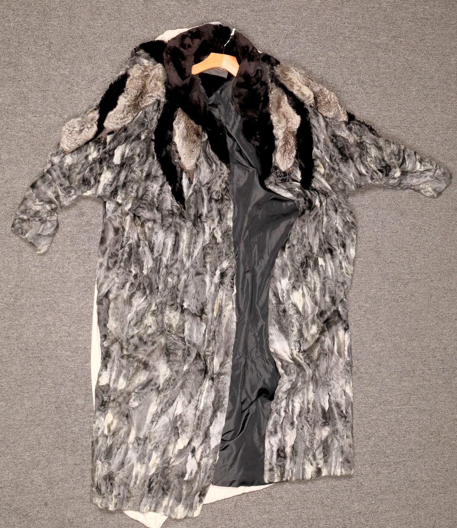 A full length women's fur coat designed by New York fashion designer Kip Kirkendall and sold through Beverly Hills furrier Somper Furs. It's been determined that it is more likely made of Rex rabbit, one of Kirkendall's main materials for design. The colors range from gray to slate. It's adorned with rhinestones. There's a small seam separation halfway down the left side, that can easily be repaired.