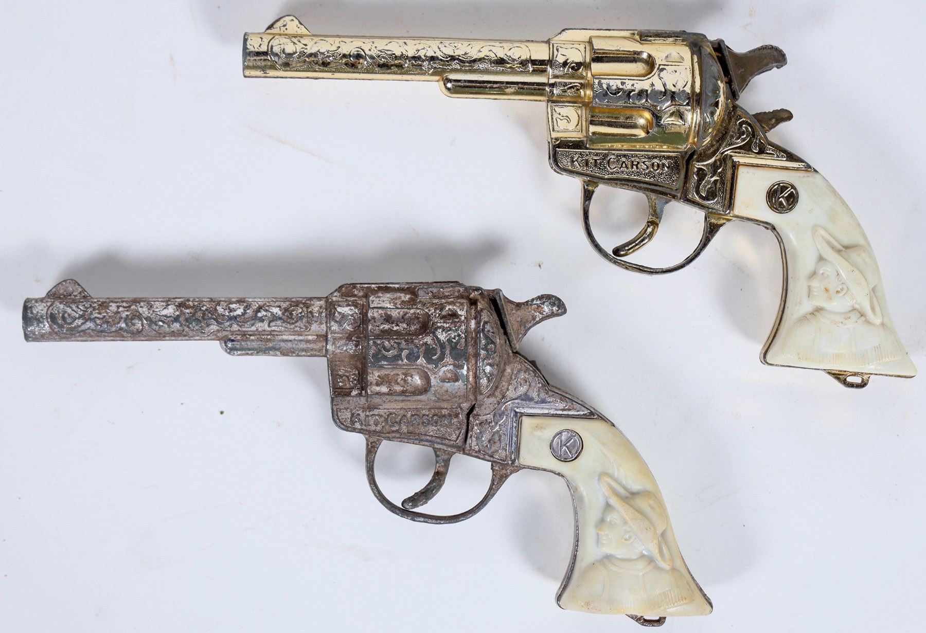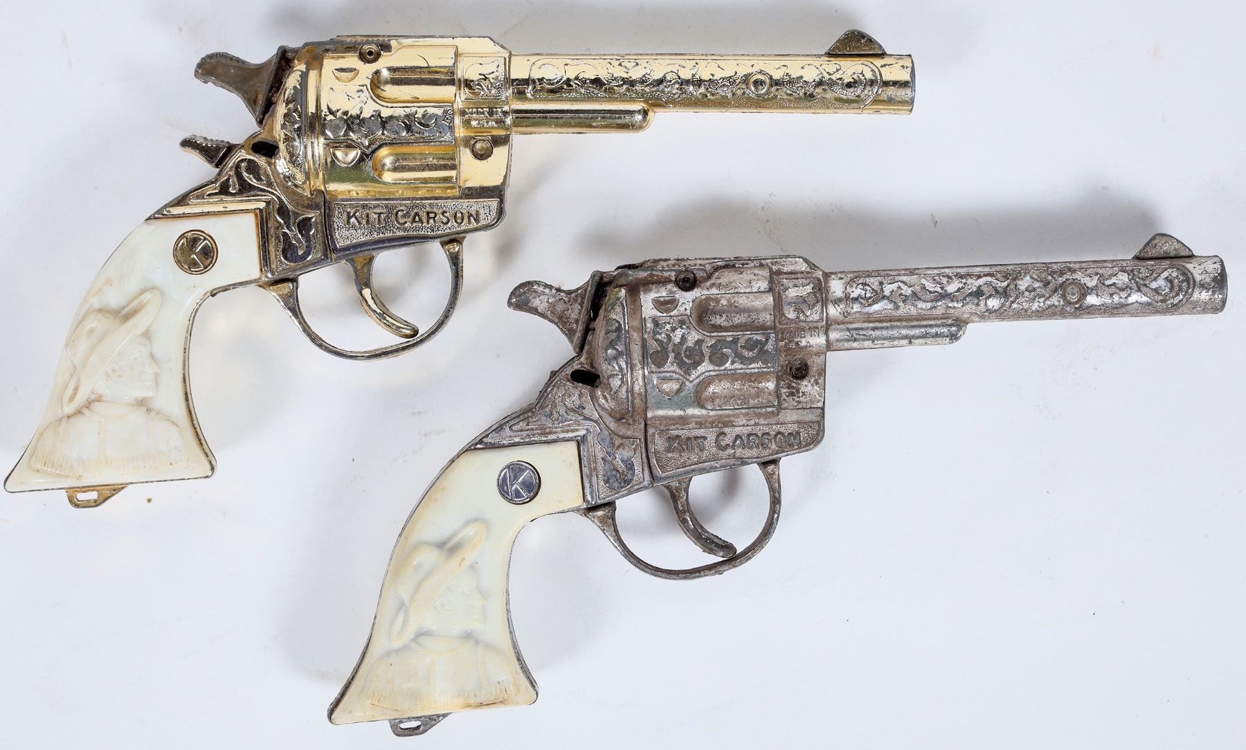 This pair of Kilgore Kit Carson cap pistols have seen a few gun fights with one silver and one gold framed guns, imitation ivory grips with the likeness of Kit Carson in relief. The gold gramed gun is in better condition than the silver one. Each has a black vinyl holster in good condition. Please see photos for details.