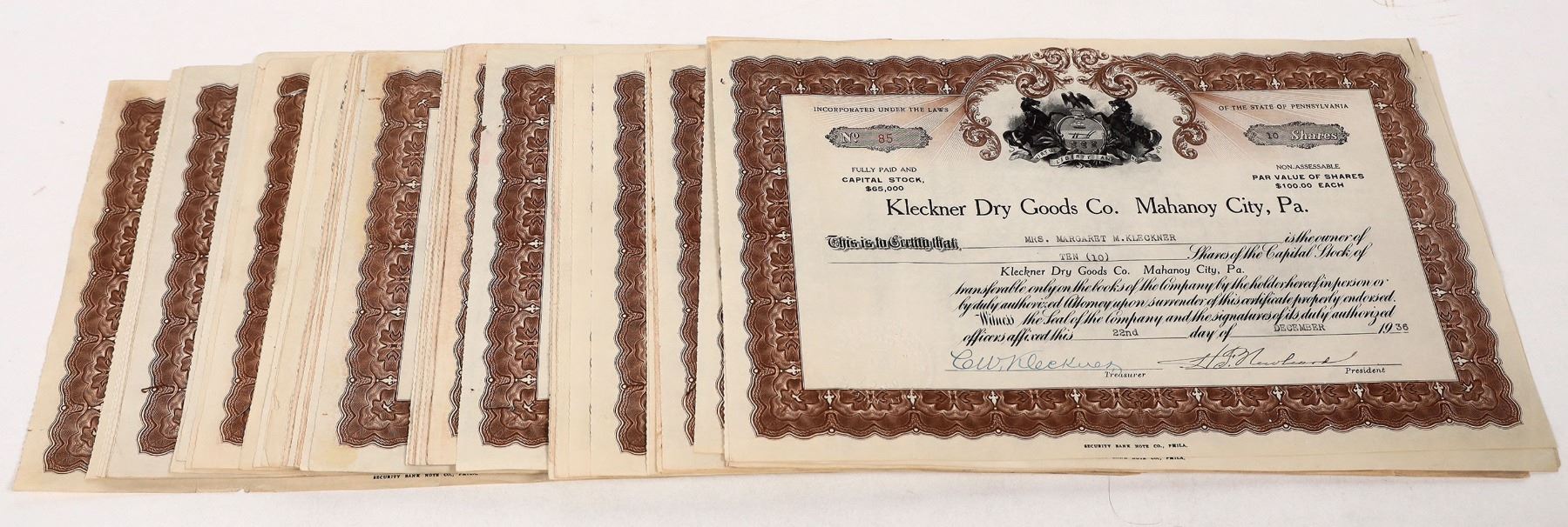 About 60 issued 1920-36 Kleckner Dry Goods stocks. A clothing company.