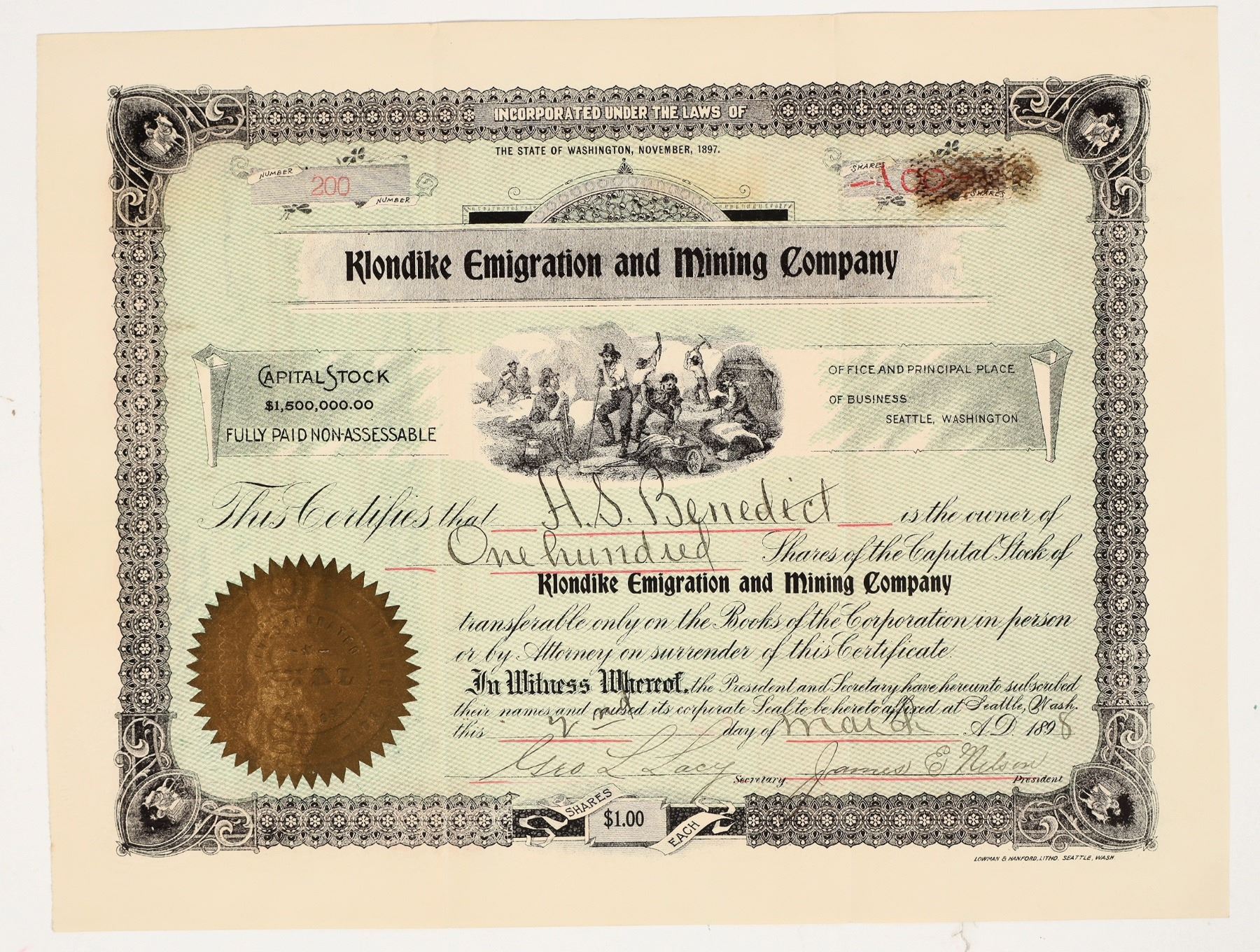 Inc. in Washington, 1897. No. 200, issued for 100 shares to HS Benedict in Seattle in 1898. Signed by president James Nelson and secretary Geo. Lacy. Not cancelled. Black border, green underprint, mining vignette. Folds, stain upper right on reverse that bleeds through. 8.5 x 11"
