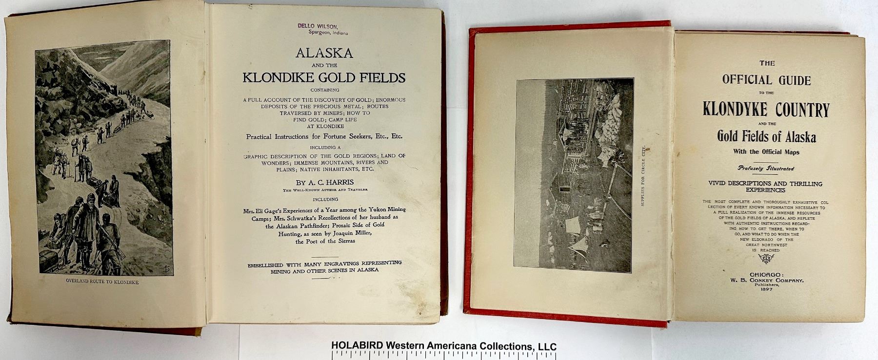 2) Alaska and the Klondike Gold Fields by A. C. Harris, 1897, G.W. Bertron. Containing "A Full Account of the Discovery of Gold, enormous Deposits of the Precious Metal, Routes Traversed by Miners, How to Find Gold, Camp Life at Klondike."