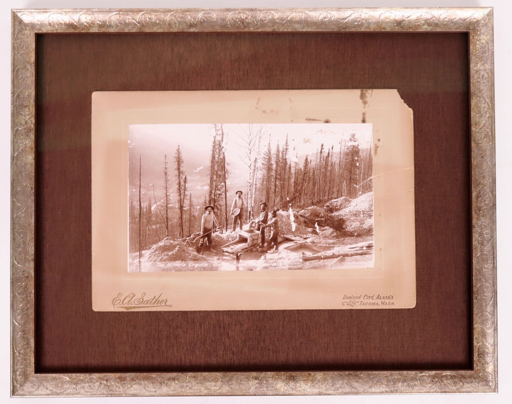 Framed mounted photograph taken by EA Sather of Dawson City, Alaska and Tacoma, Washington. Text at the bottom reads "The Miners Cradle. Berry Claim on Eldorado." Excellent view of four miners with gold pans and a sluice box high up in the hills above the Klondike River. Eldorado Creek was a tributary of Bonanza Creek that flows into the Klondike River near Dawson City. Photo is 4.5 x 7.75" on 6.75 x 10" mount in 12 x 15" frame. Mount has some stains and is missing the upper right corner.