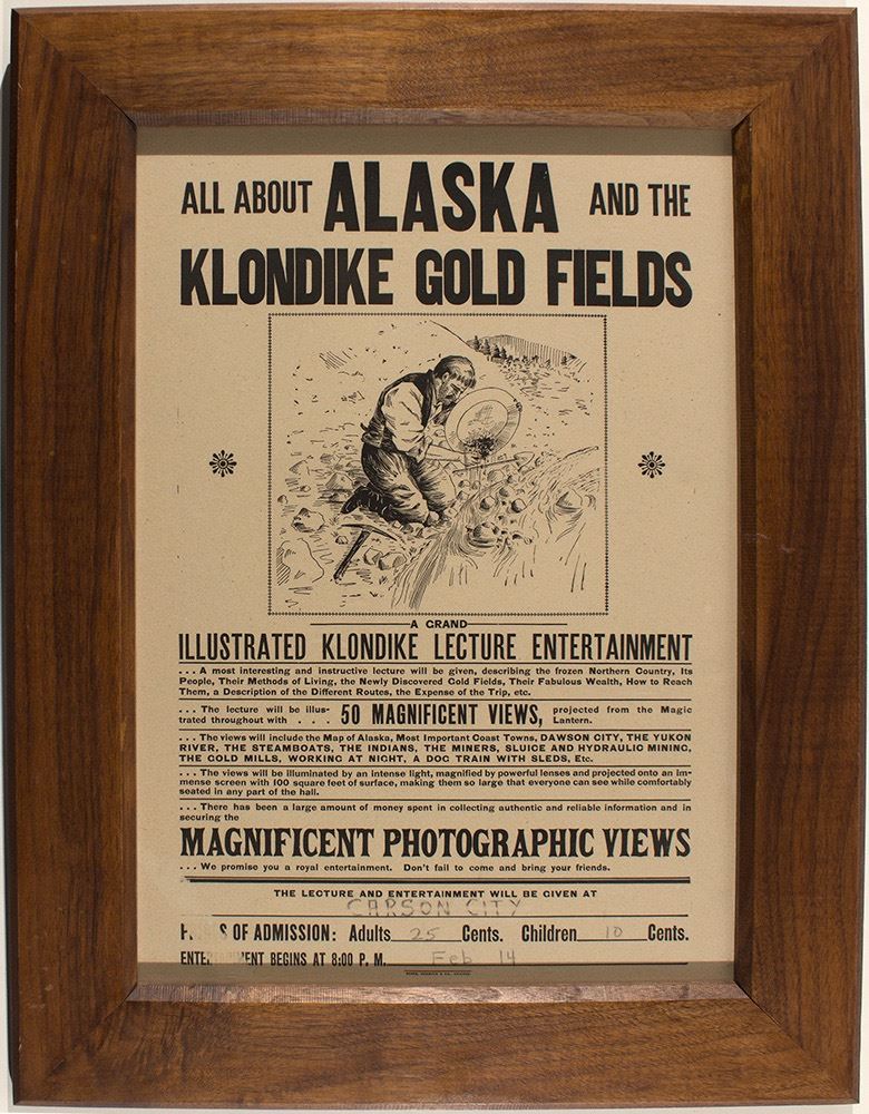 This poster was meant to entertain and inspire. This lecture was shown in Carson City on February 14, 1898 [Reno newspapers]. Did anyone attending this lecture find their way to the Alaska Gold Fields? Prospecting in Nevada was at a low and many miners, prospectors and investors found their way to the Klondike. HWAC# 24515 Date: 1898 Location: Klondike, Alaska