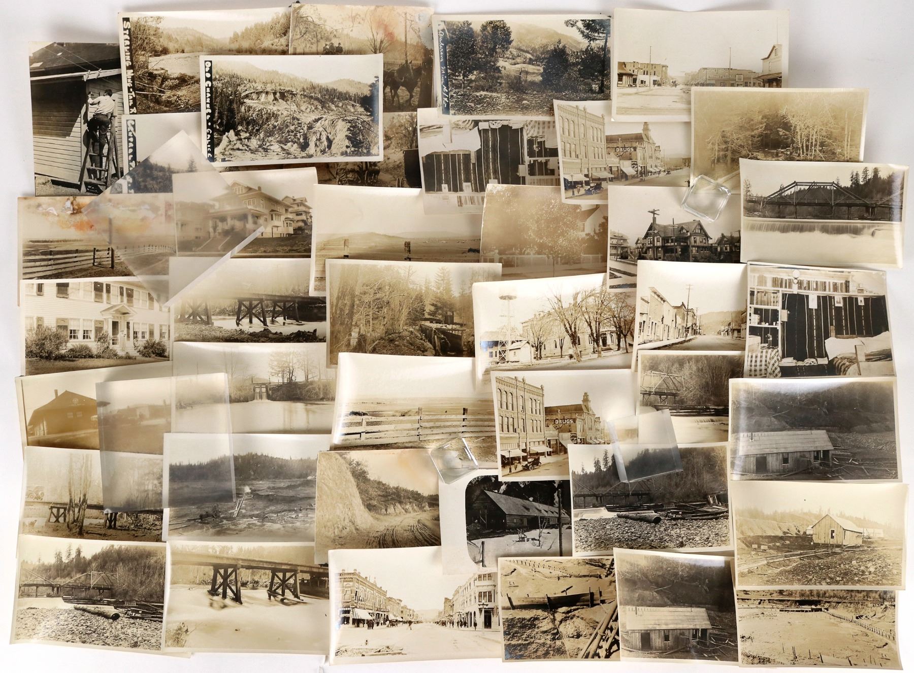 About 40 c. 1911-29 photos of Seattle and the Klondyke. Bridges, street scenes, buildings, Sterling Mine, mine wood buildings etc. About 3.25x5.25". A few have some damage, please inspect.