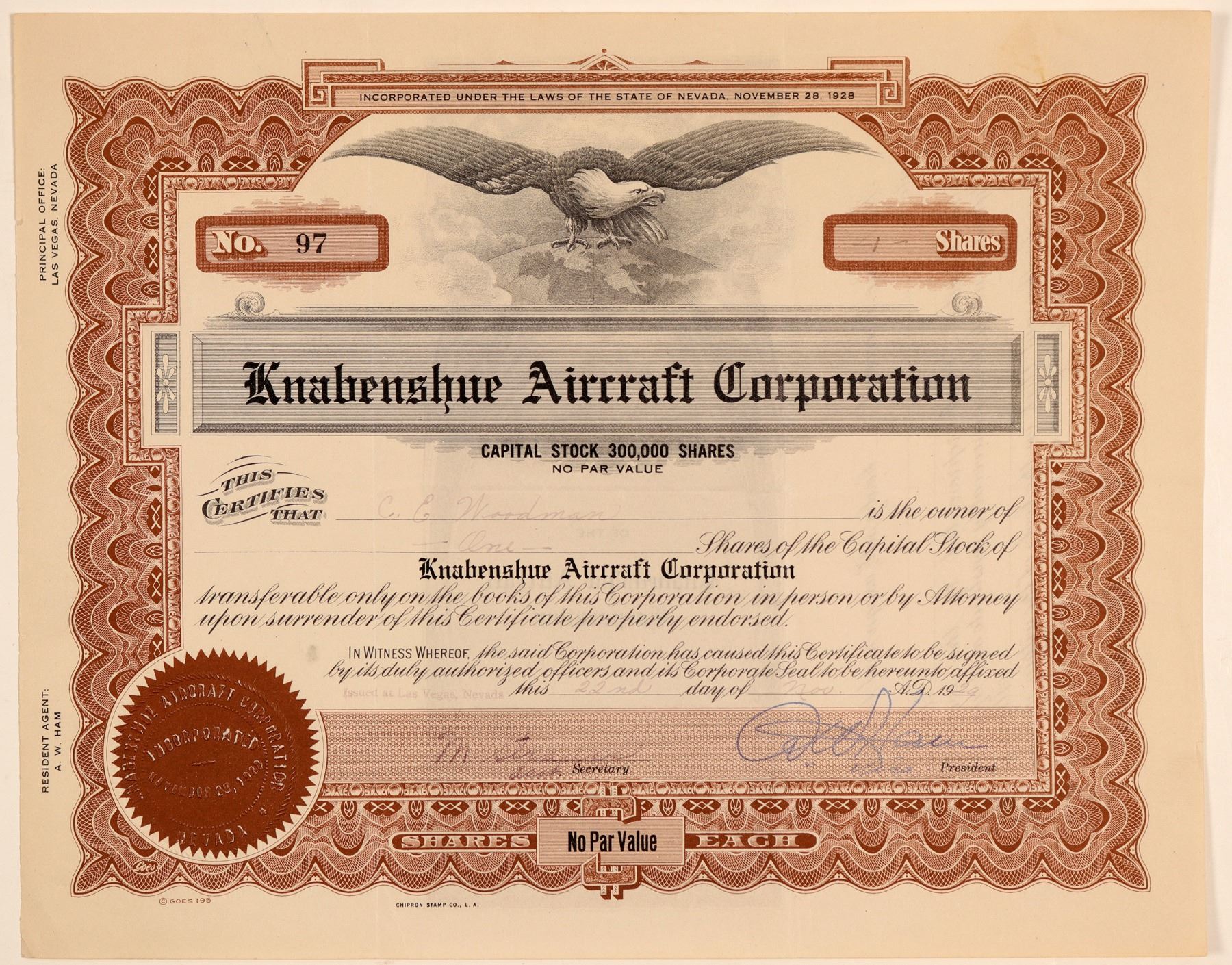 Knabenshue Aircraft Corporation was formed in 1917 by A. Roy Knabenshue to produce dirigibles, kite balloons and parachutes. During the First World War, this company made captive observation balloons for use by the United States Navy. Knabenshue gained fame with his dirigible performances at the St. Louis World Fair in 1904. This stock is incorporated in Nevada. No. 97, issued for 1 share to C.E. Woodman on Nov. 22nd, 1929 in Las Vegas. Signed by the vice-president and assistant secretary. Not cancelled. Brown border and seal, eagle on globe vignette. Folds, some fading of the ink, paperclip indent/stain on reverse. 8.5 x 10.75"