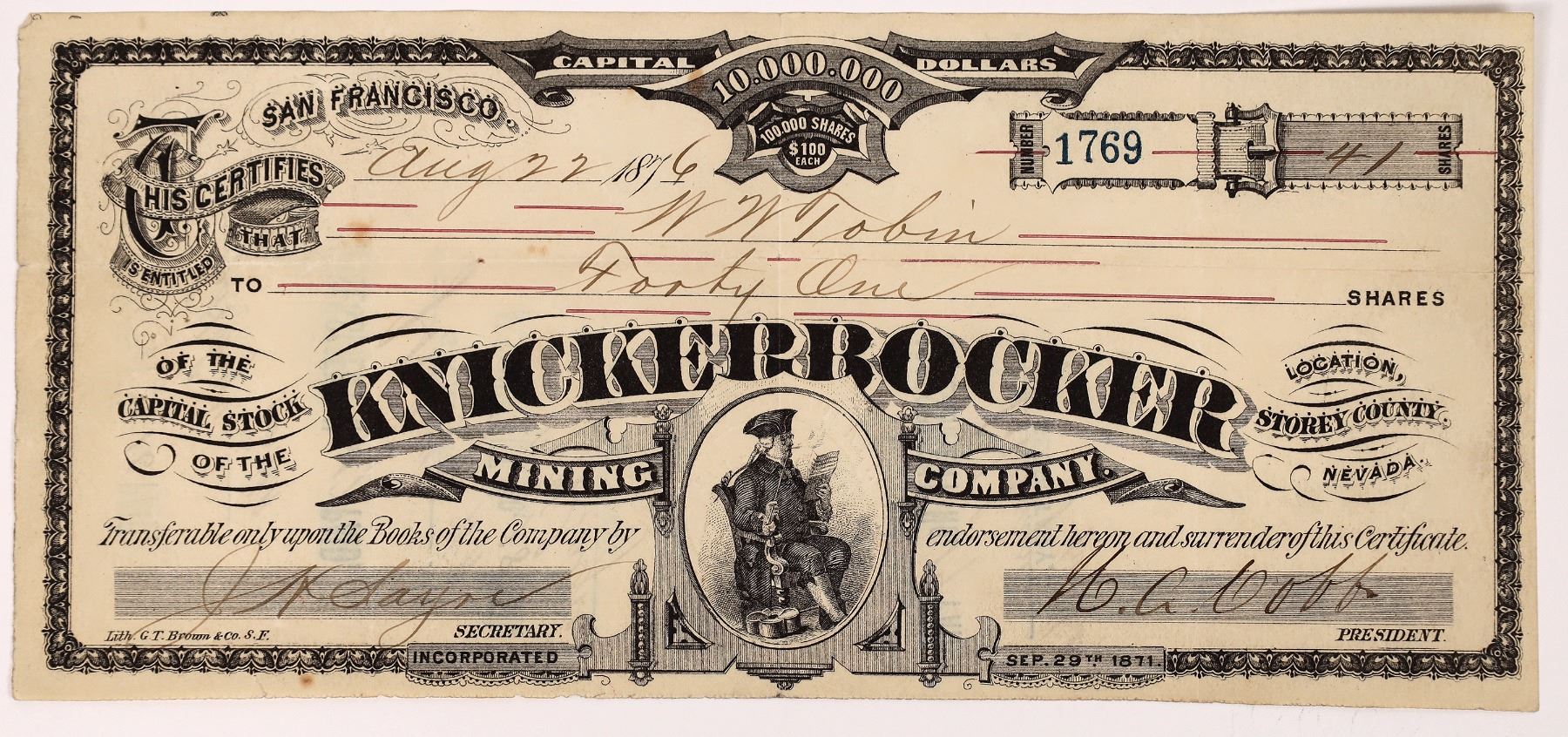 Knickerbocker Mining Company Stock Certificate. Virginia City. Storey County. Aug 22, 1876. Storey County. Incorporated 1871. Issued to W.W. Tobin in 1876. Signed by Cobb, President and J. W. Sayre, Secretary. Stamped on reverse with assessment stamps and signed four more times by Sayre. Litho G. T. Brown & Co of S.F. Uncancelled. Approx. 4.25" x 9.25". Black print on crËme paper. Vignette of colonial gentlemen reading in circle at bottom center. Embossed seal over vignette. Certificate No. 1769 for 41 shares. Creases and folds, otherwise fine. Very Rare. Virginia City Nevada 1876